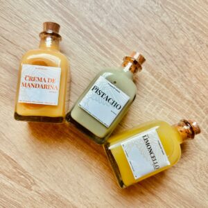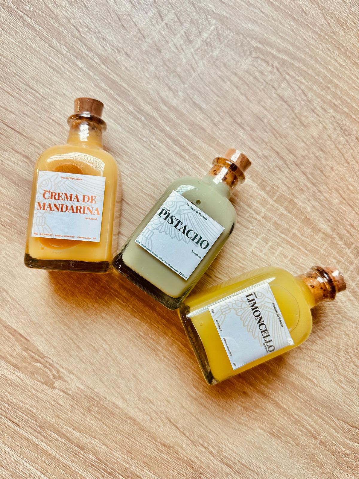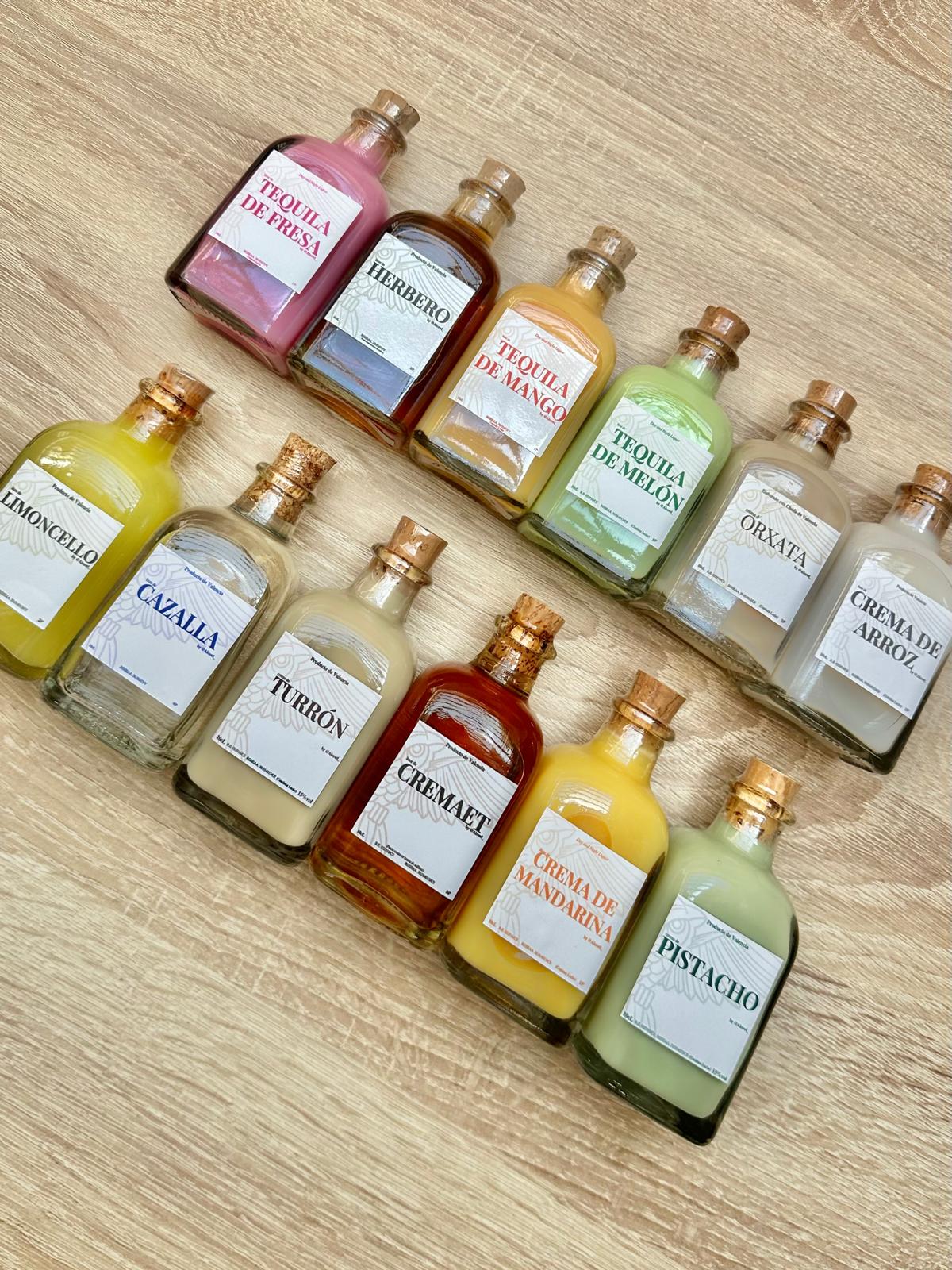 Mini botellitas de licor de 10 CL de diferentes sabores como: Licor de Cremaet, Licor de Herbero, Licor de Cazalla, Licor de Crema de Cazalla, Licor de Crema D’Orxata de Chufa, Licor de Crema de Arroz, Licor de Tequila de Fresa, Licor de Tequila de Mango, Licor de Tequila de Melón Licor de Crema de Mandarina, Licor Limoncello, Licor Crema de Pistacho y Licor de Crema de Turrón.
