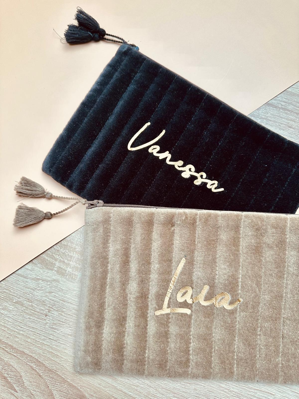 Neceser de terciopelo con costuras decorativas y tirador en pompón. Personalízalo con el nombre que quieras.