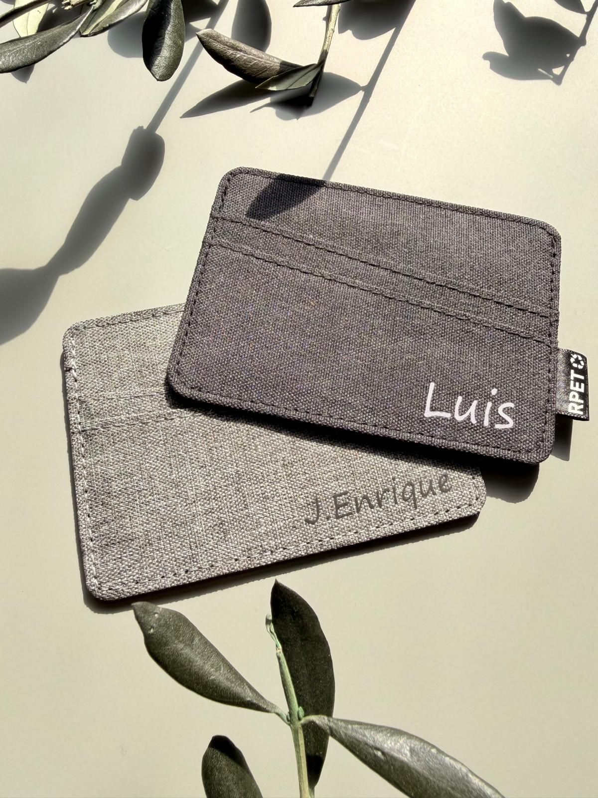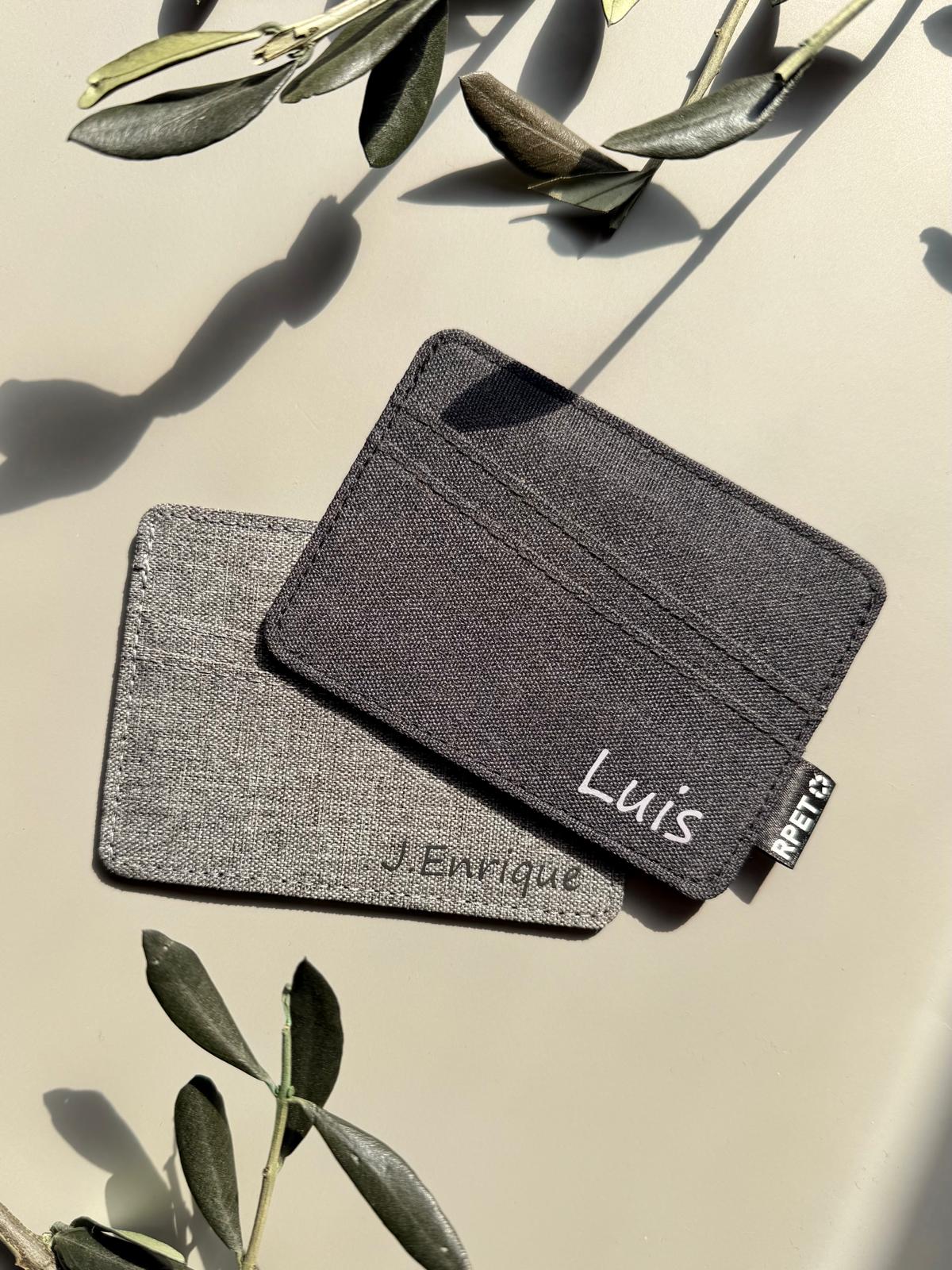 Tarjetero fabricado en poliéster RPET 300D. Con 3 compartimentos independientes para tarjetas.
