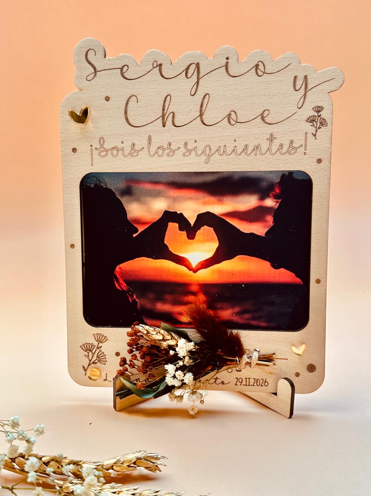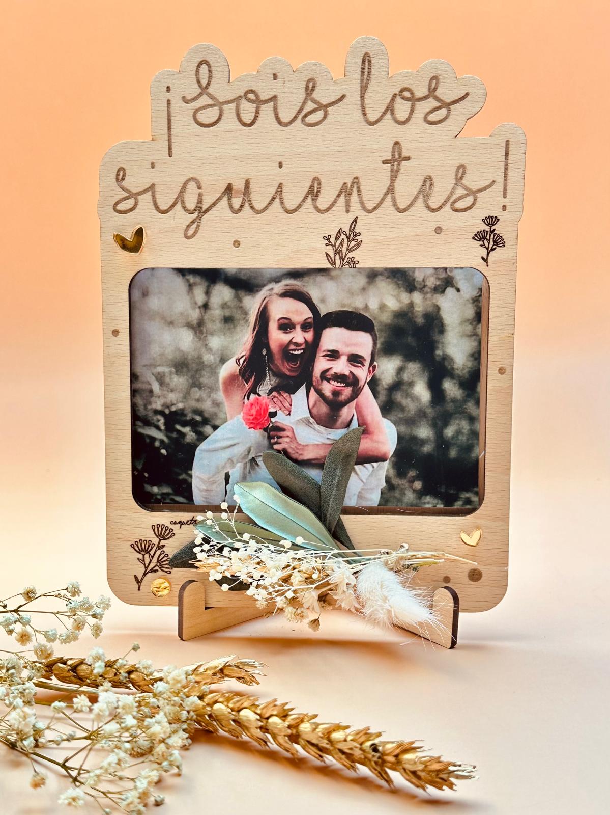 Si deseas, puedes elegir la opción de personalizar y dedicarlo especialmente a alguna pareja. Para ello, seleccionar la opción SI en personalizar y escribe en el apartado «Personaliza aquí», el nombre de la pareja a la cual se le va a regalar y un pie de marco como firma de quién la regala y fecha, todo ello opcional (Por ejemplo: María y Rubén «Sois los siguientes» Celia y Guille 22.06.2024)