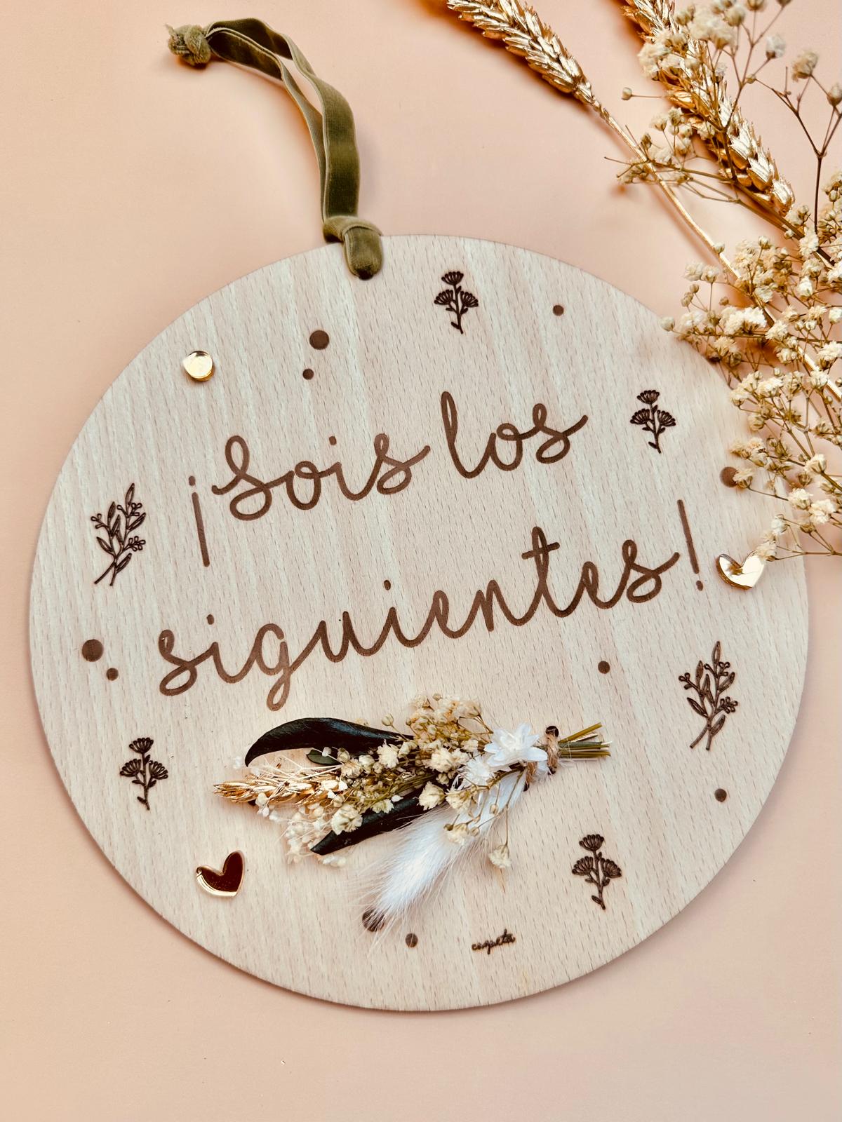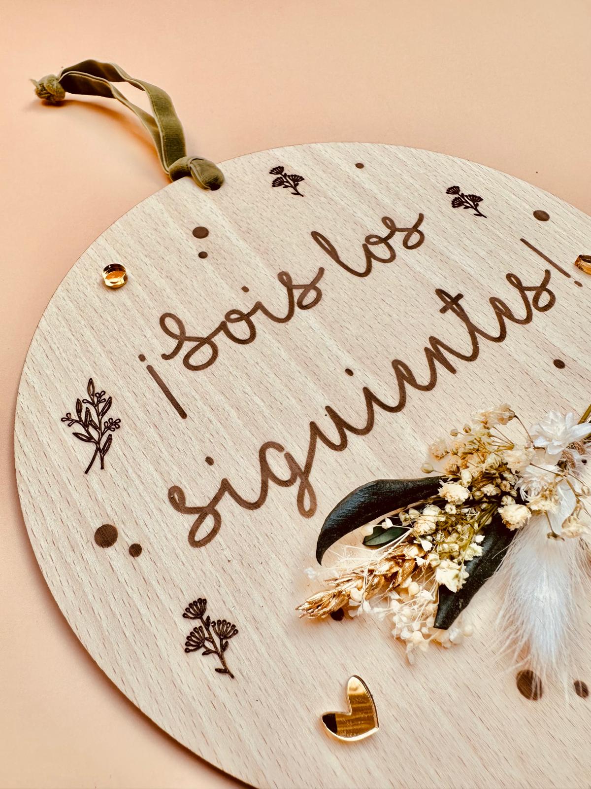 Placa de la Colección FLORAL ORO, «Sois los siguientes» elaborado en madera de haya de 20cm de diámetro y metacrilato espejo dorado.