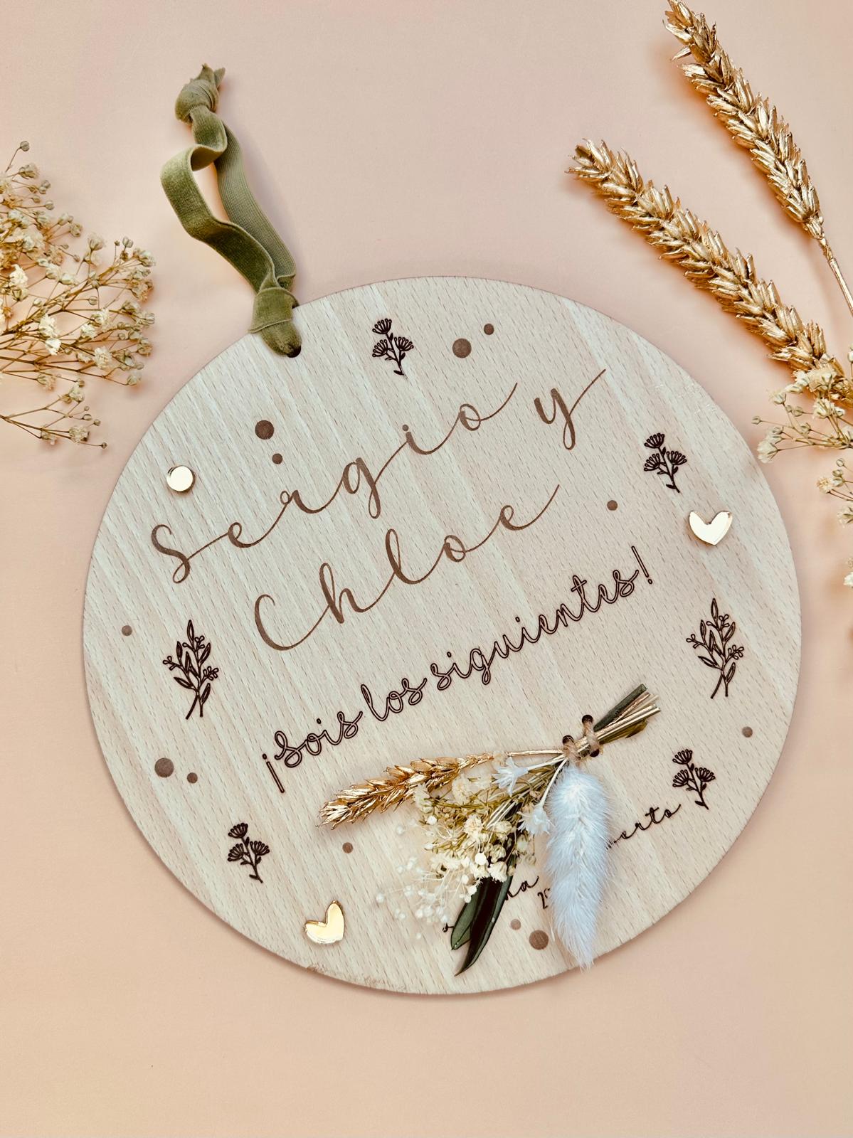 Si deseas, puedes elegir la opción de personalizar y dedicarla especialmente a alguna pareja. Para ello, seleccionar la opción SI en personalizar y escribe en el apartado «Personaliza aquí», el nombre de la pareja a la cual se le va a regalar y un pie de placa como firma de quién la regala y fecha, todo ello opcional (Por ejemplo: María y Rubén «Sois los siguientes» Celia y Guille 22.06.2024)