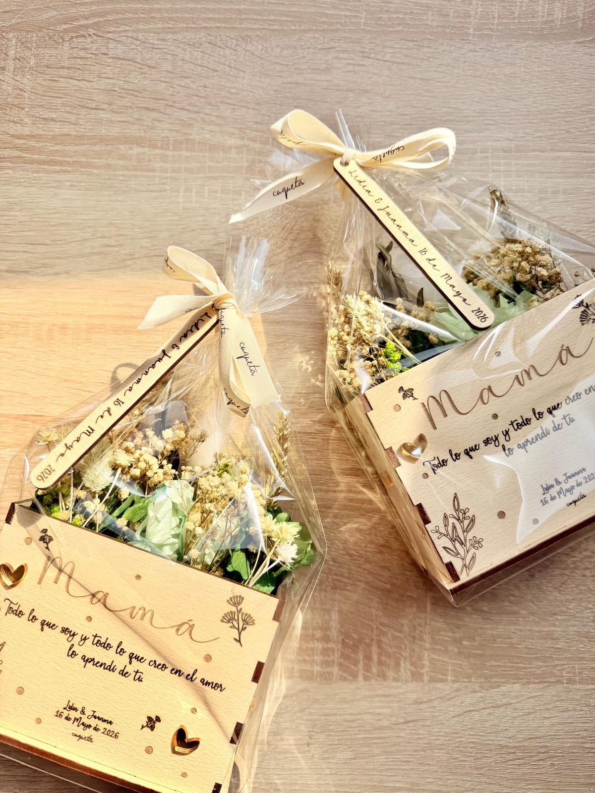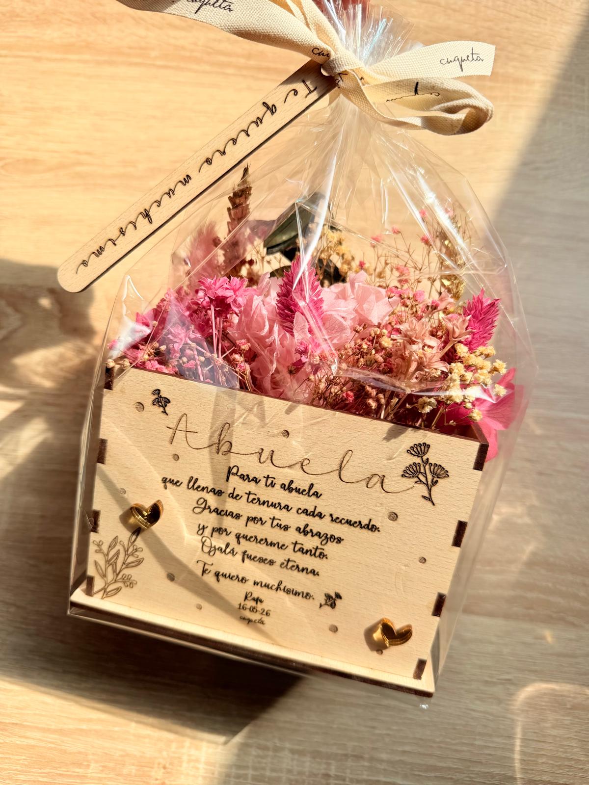 Caja de madera de haya, modelo FLORAL ORO elaborada artesanalmente con flores preservadas, como hortensia preservada, avena, paniculata, etc… Tiene una medida de 15x10x9cm aproximadamente.