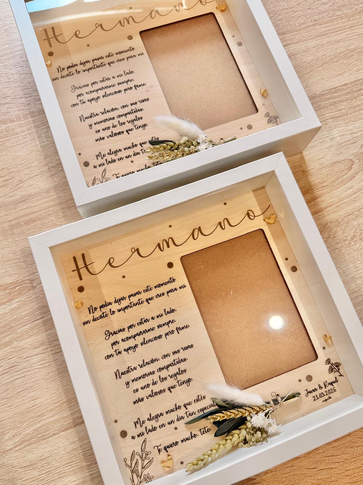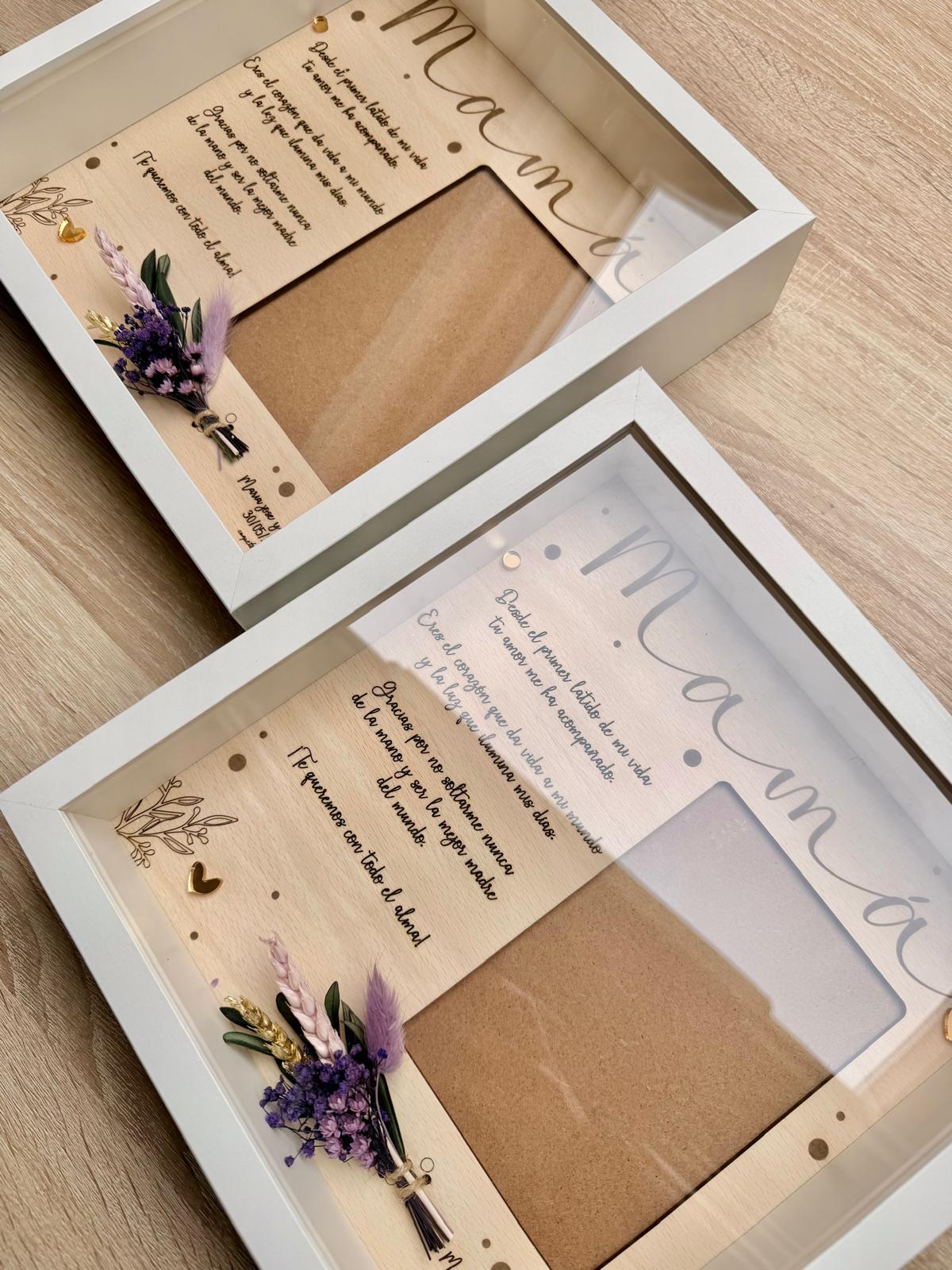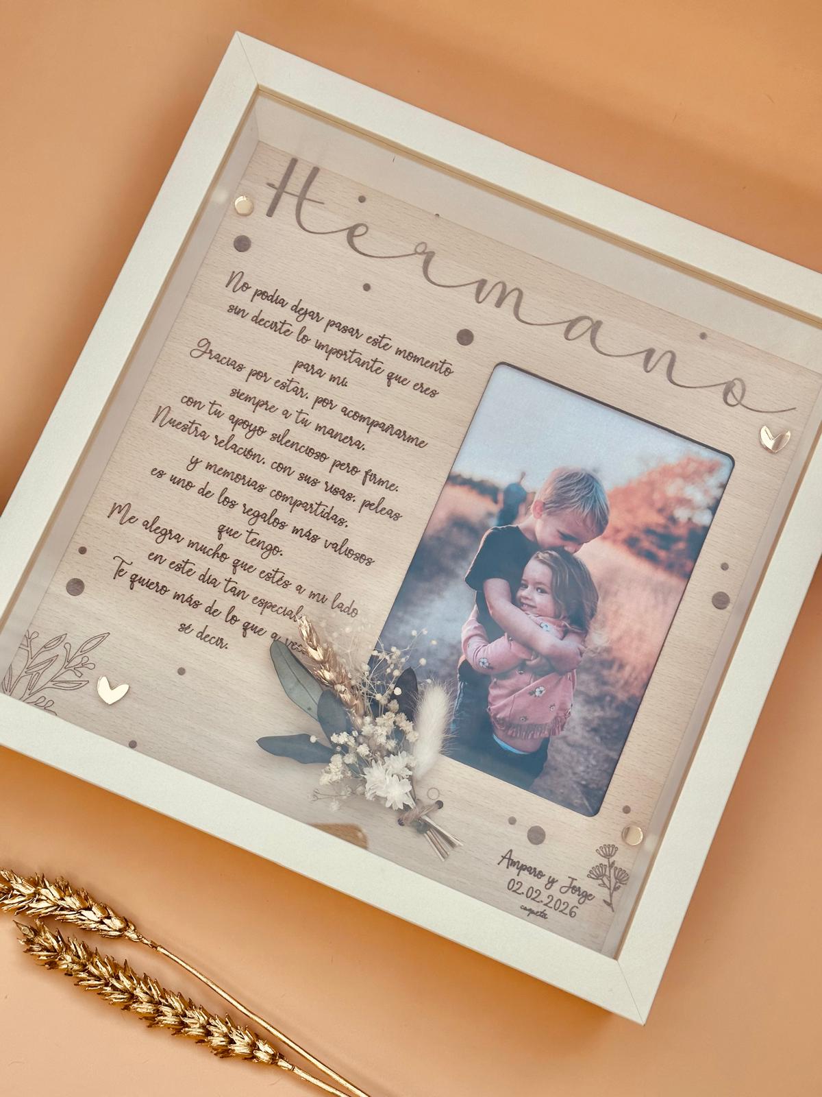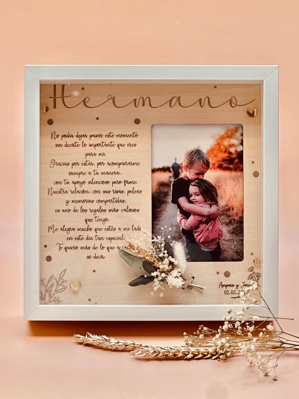 Lámina de madera de haya modelo FLORAL ORO de 25×25 aprox. con dedicatoria personalizada, para foto de 10×15 aprox. en vertical.
