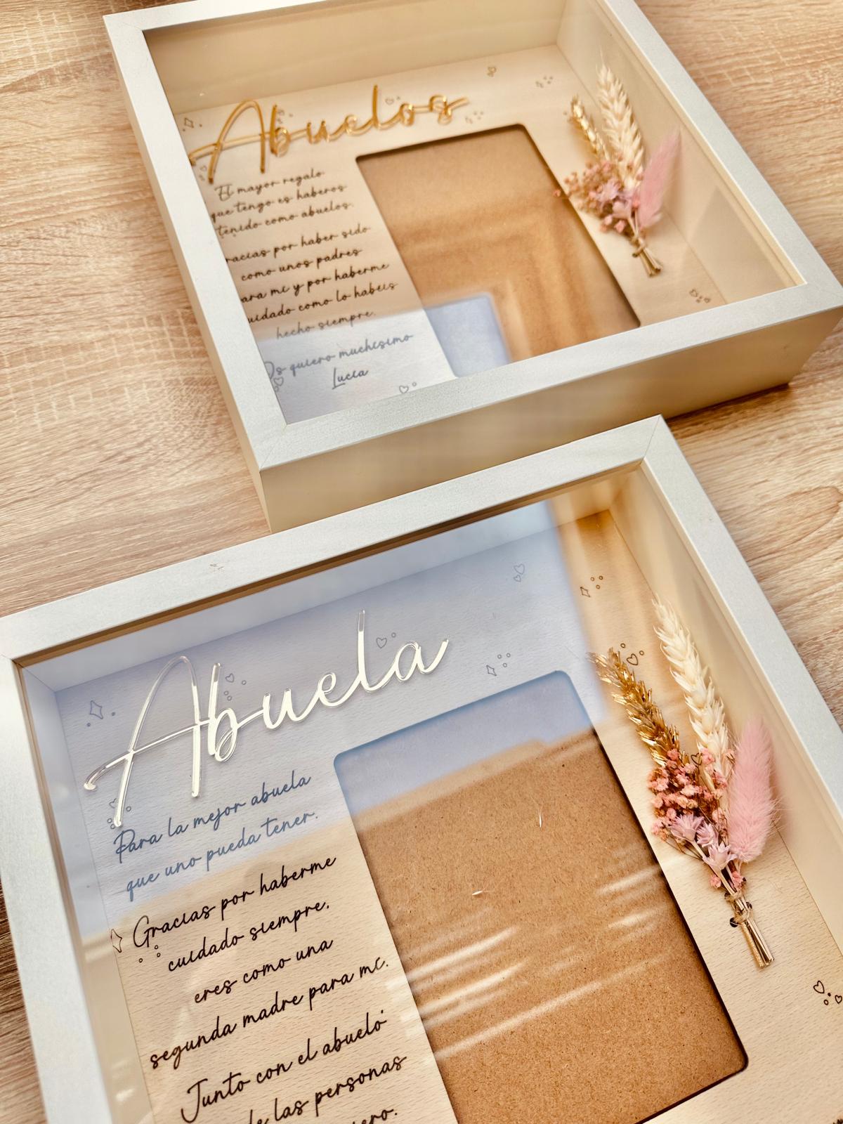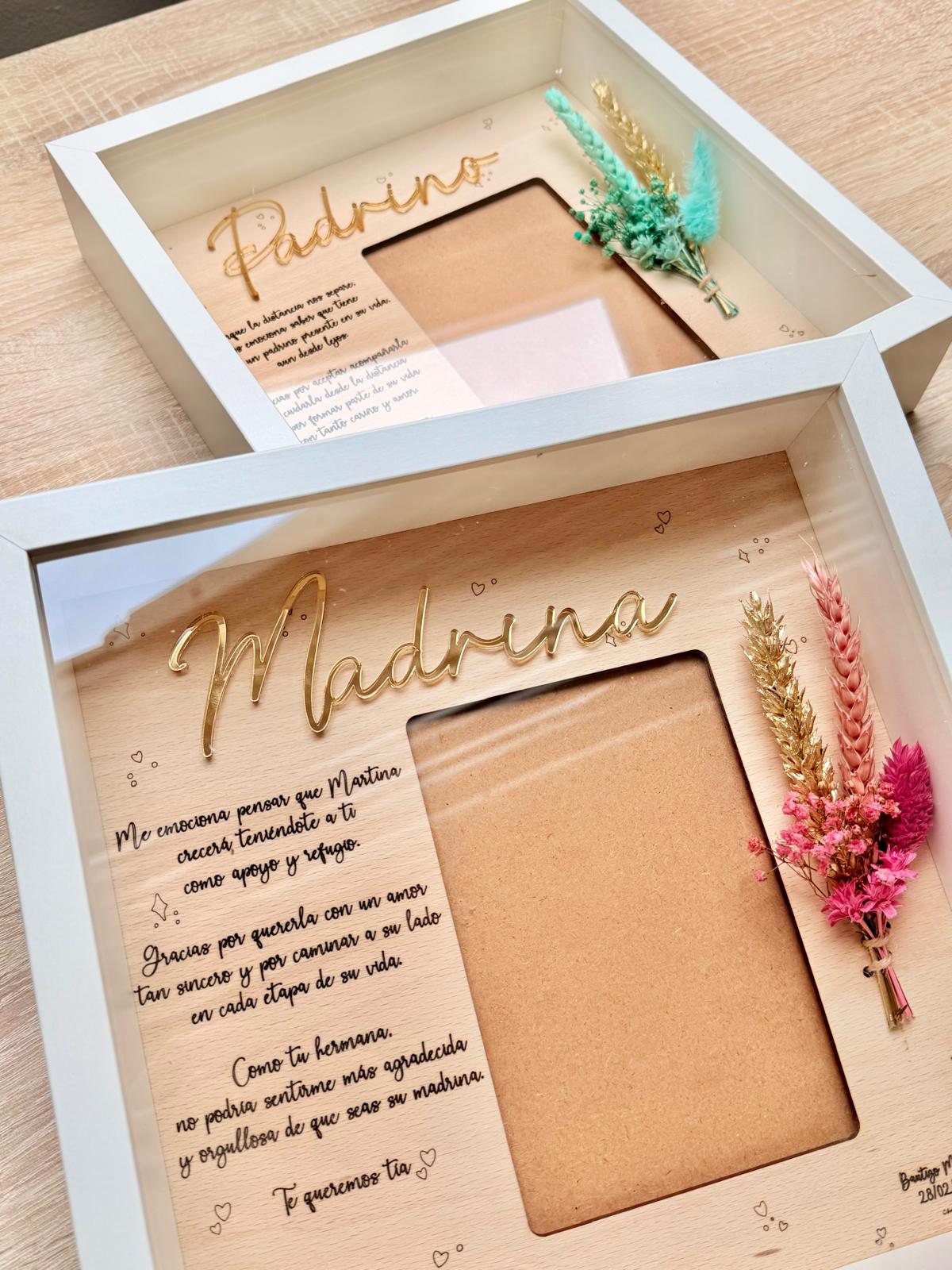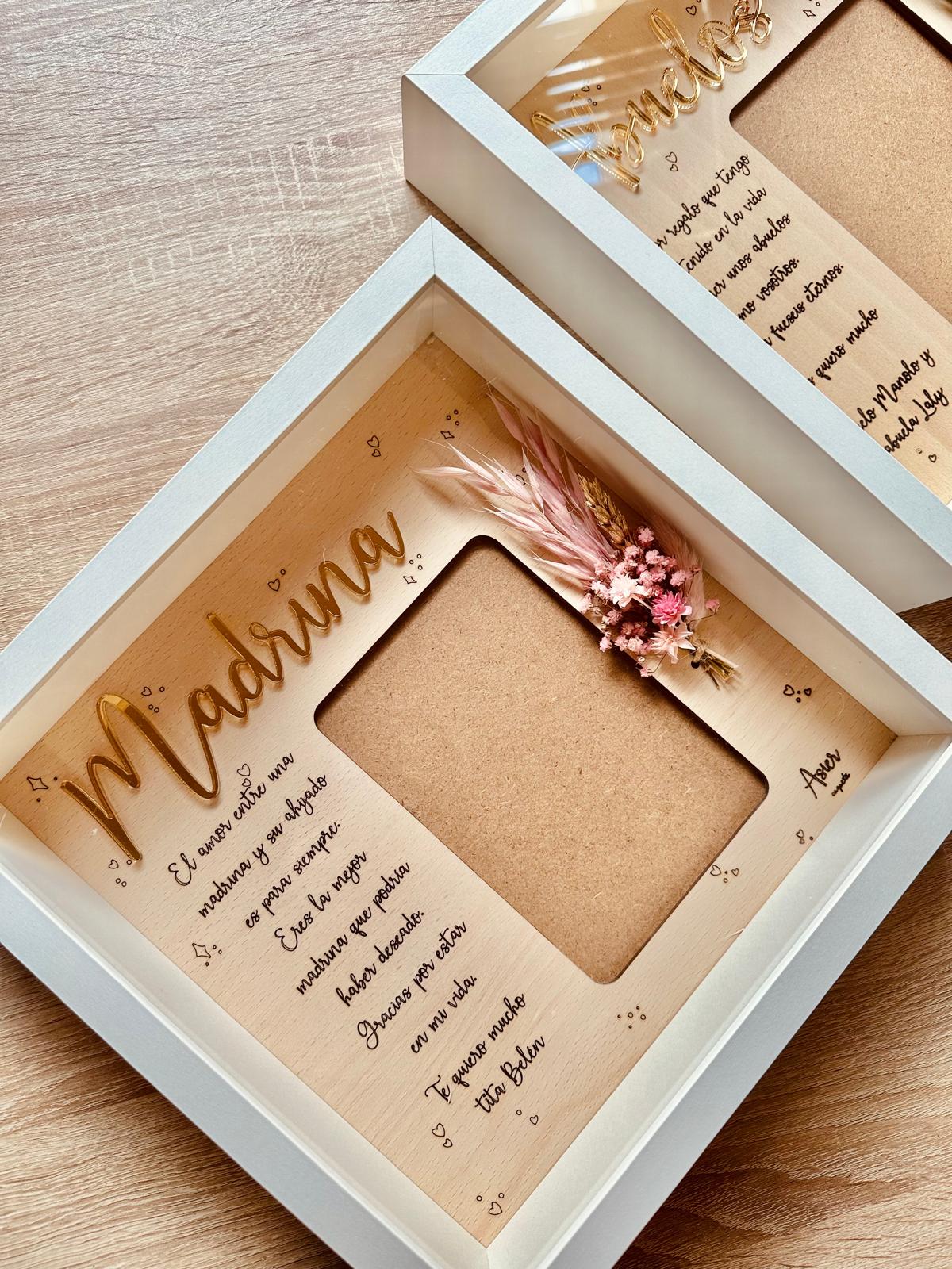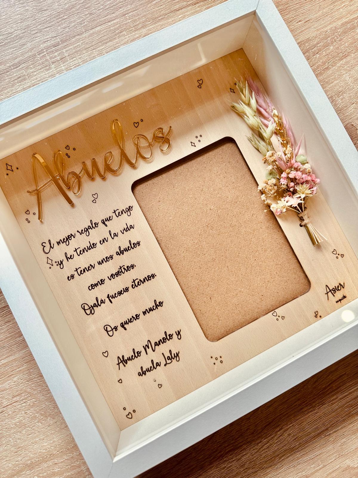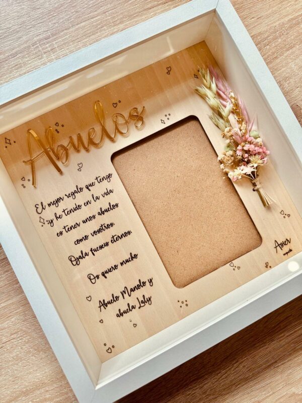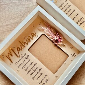 Lámina de madera de haya de 25×25 aprox. con dedicatoria personalizada, para foto de 10×15 aprox. en vertical.