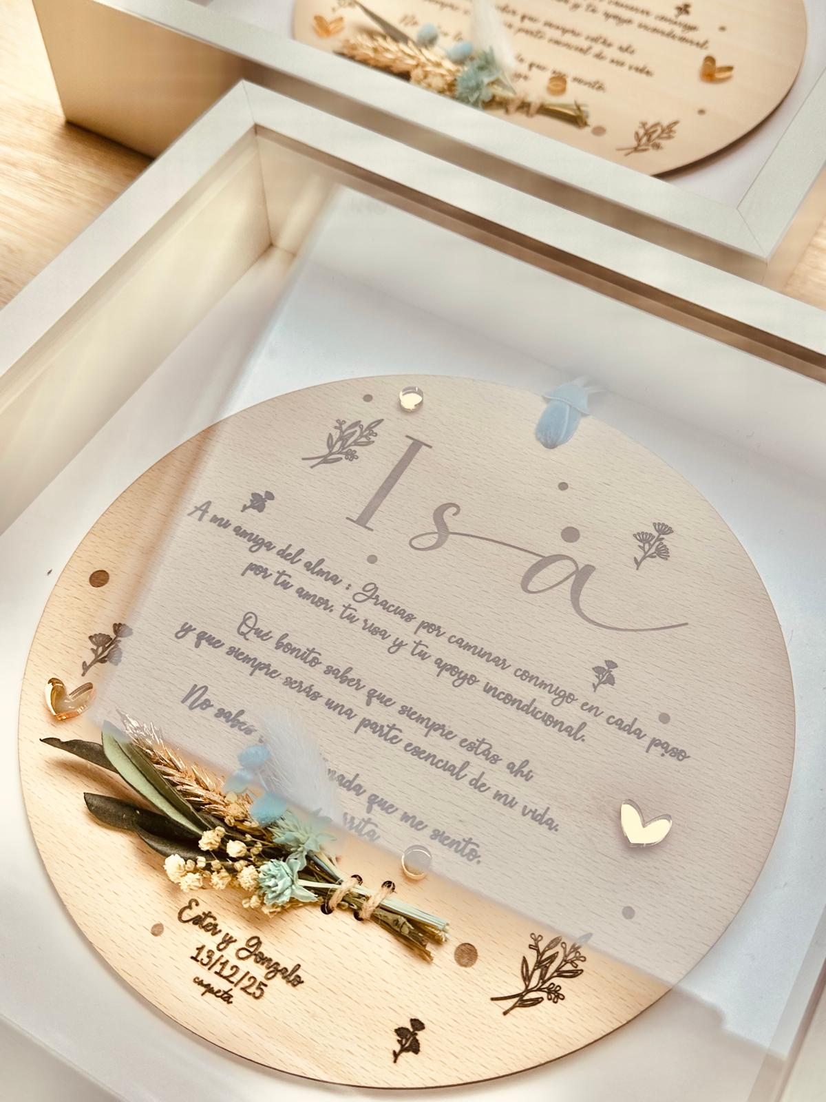 Placa Dedicatoria de la Colección FLORAL ORO Personalizada, elaborada en madera de haya de 20cm de diámetro y metacrilato espejo dorado.