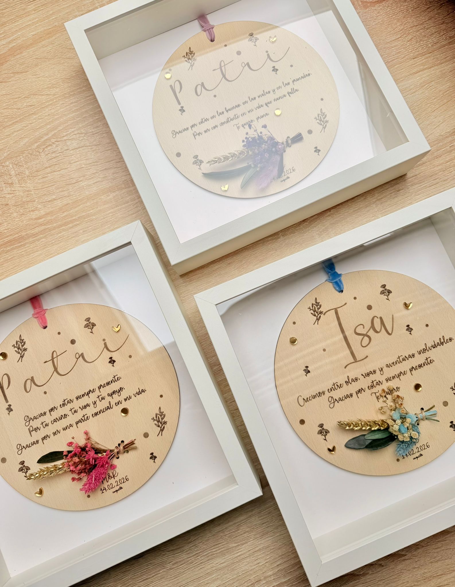 La placa lleva un ramillete de flor preservada en horizonal, que se mantiene perfecta durante años y no se marchita, y cinta de terciopelo en la parte superior. Hay una variedad de tonos de flor a elegir, aunque siempre llevará un toque dorado.