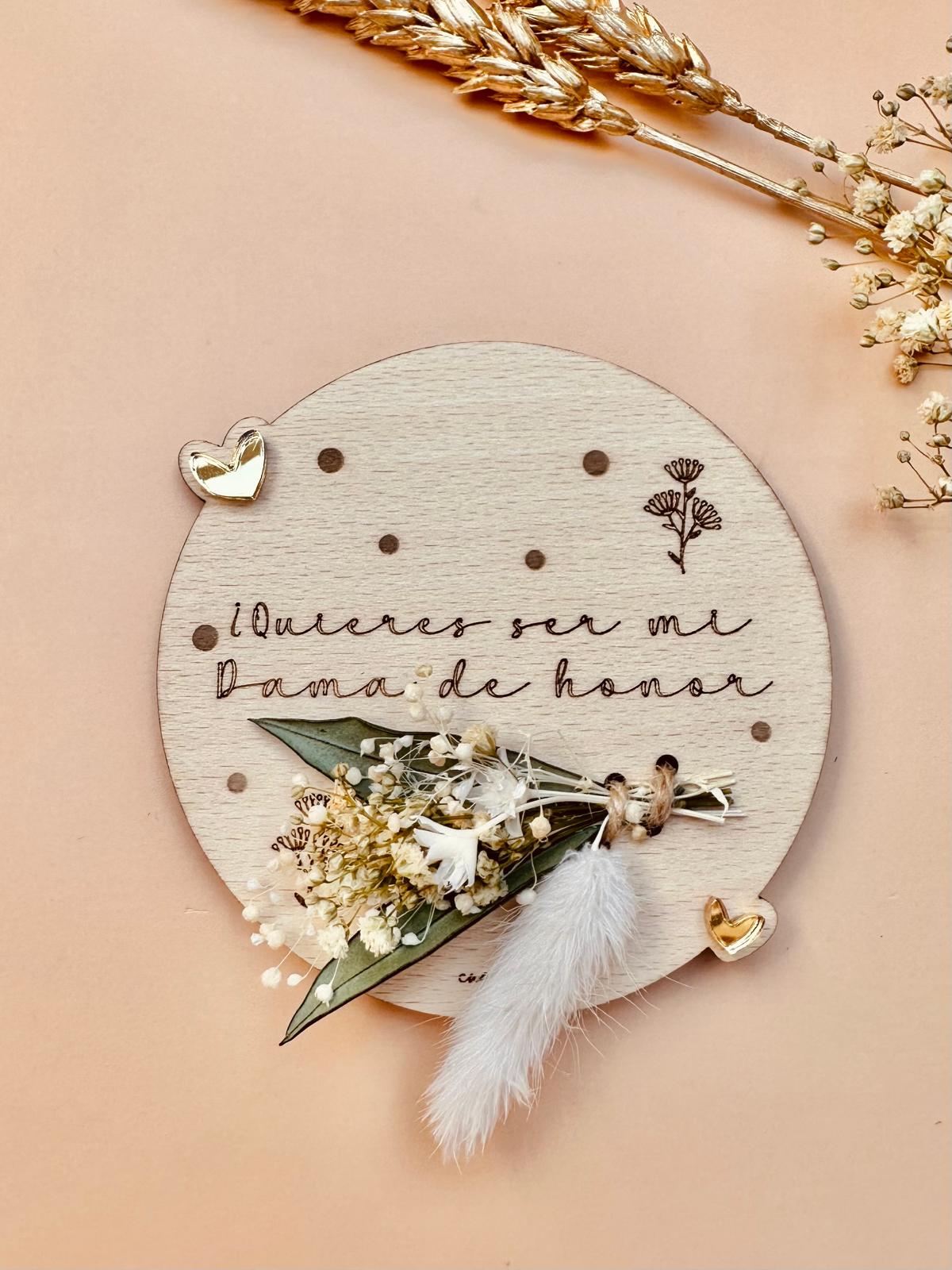 La mini placa lleva un ramillete de flor preservada en horizontal bajo de la pregunta, que se mantiene perfecta durante años y no se marchita, y cinta de terciopelo en la parte superior. Hay una variedad de tonos de flor a elegir.