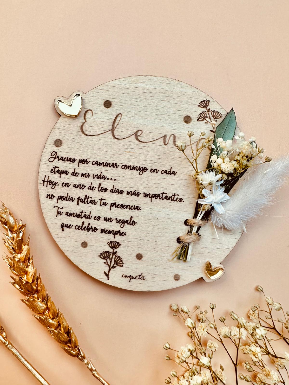 Para personalizar la mini placa, escribe en el apartado «Personaliza aquí», el nombre y a continuación la frase que quieras que grabemos. Añádele un pie de placa. Por ejemplo: Carlos, que bonito es tenerte siempre ahí. María & Luis 15/06/2025.