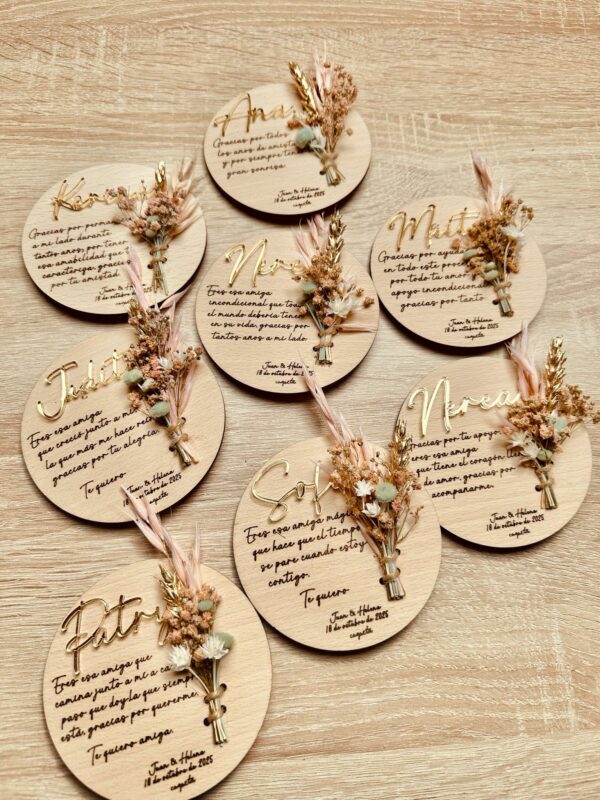 Mini placa imán oro ramillete personalizada. Regala a tus invitados un mini placa con vuestros nombres o bien personalízala por invitado o por parejas.