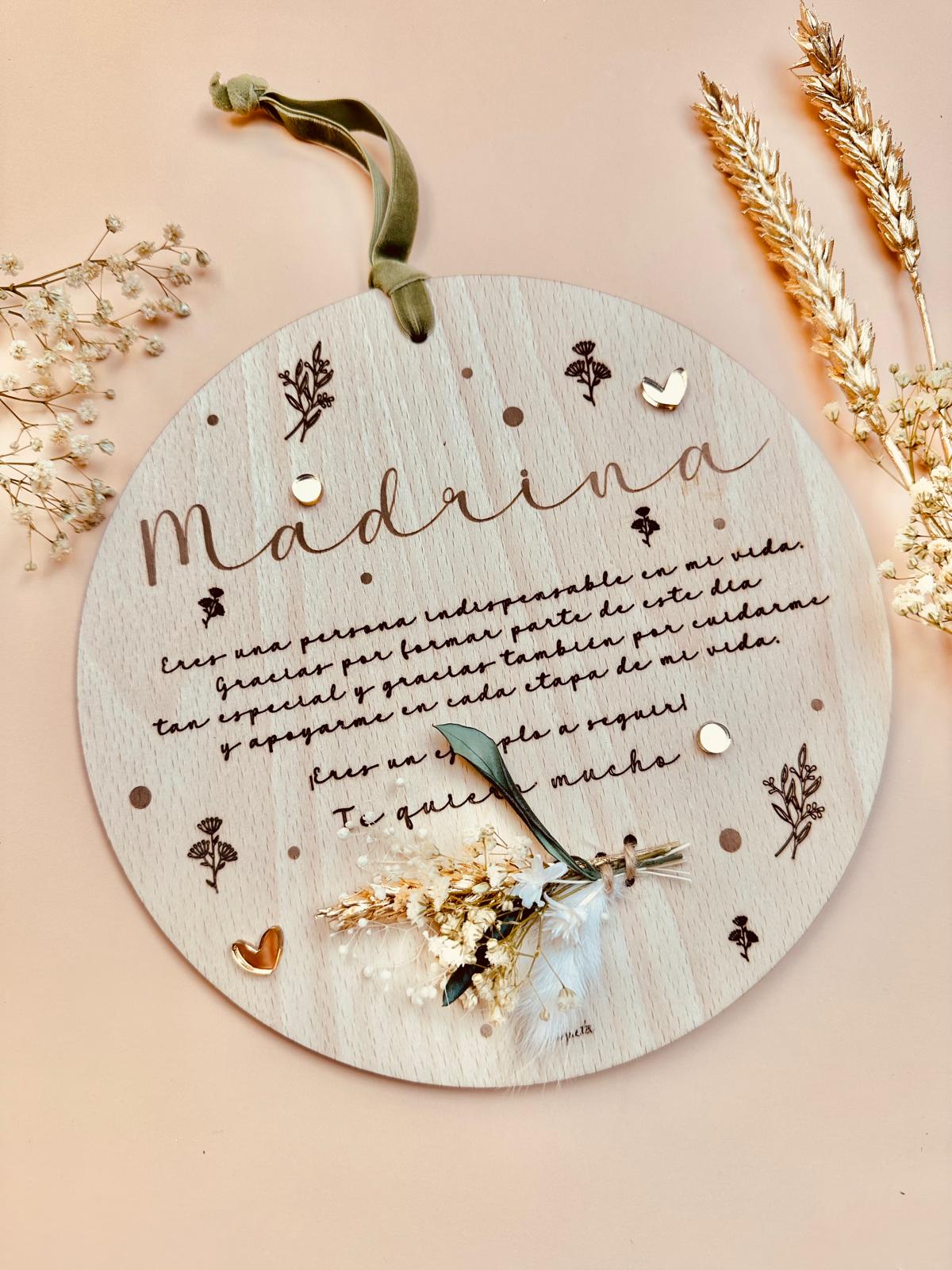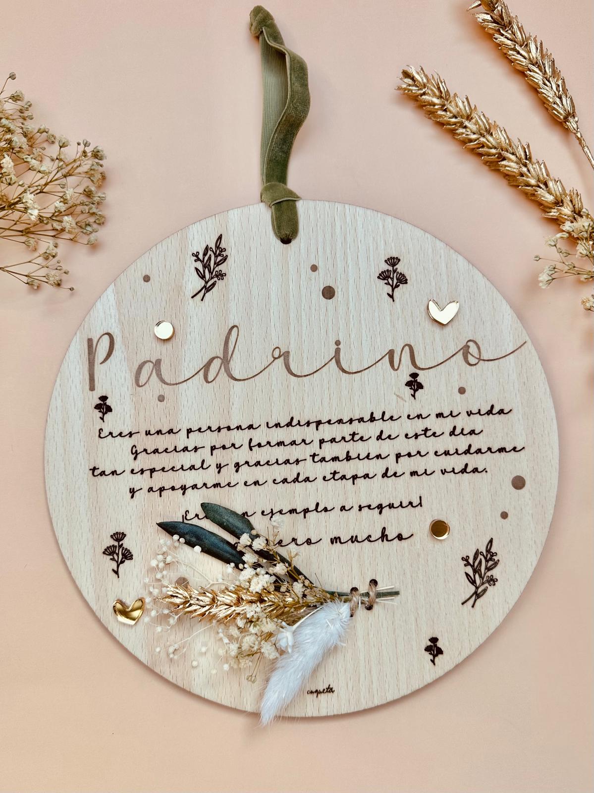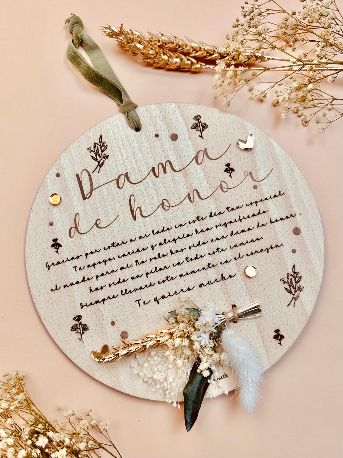 Placa Dedicatoria «Especial Eventos» de la Colección FLORAL ORO, elaborado en madera de haya de 20cm de diámetro y decoraciones en metacrilato espejo dorado.