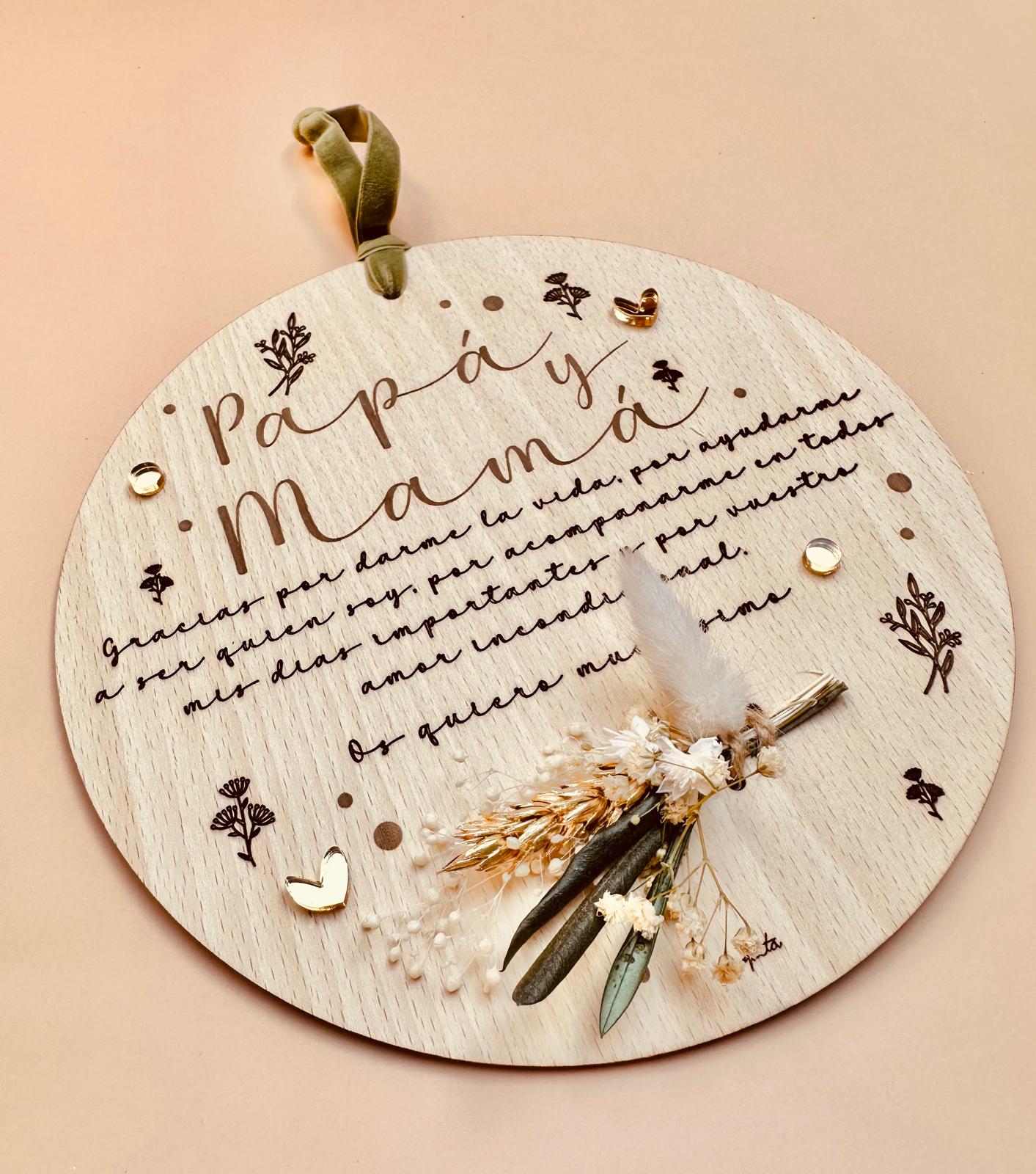 Placa Dedicatoria de la Colección FLORAL ORO, «Mamá y Papá» elaborado en madera de haya de 20cm de diámetro y decoraciones en metacrilato espejo dorado.