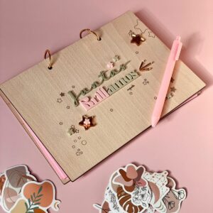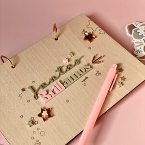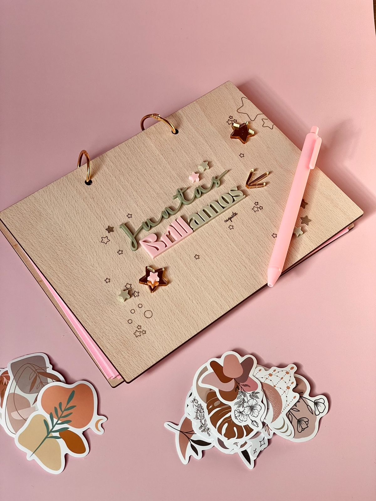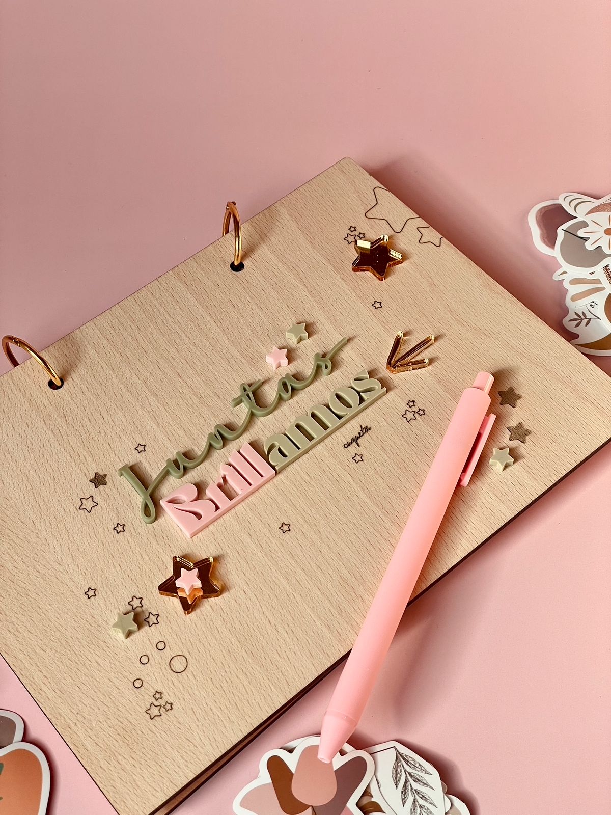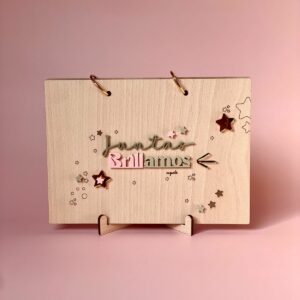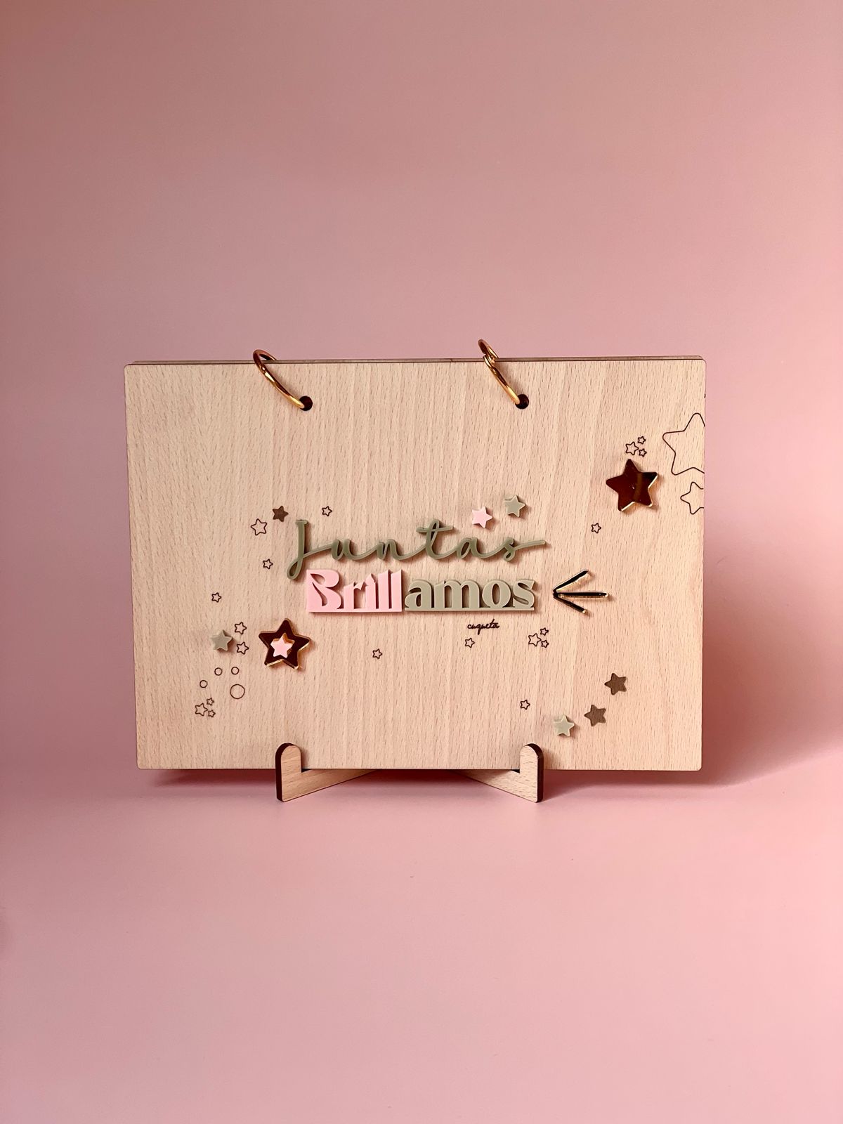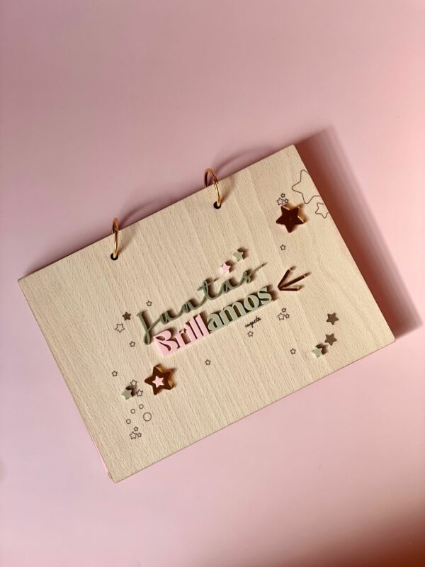 Nuevo «Álbum JUNTAS BRILLAMOS» compuesto por tapas de madera de haya con decoración en metacrilatos de diversos tonos, sujeto por anillas metálicas en color dorado.