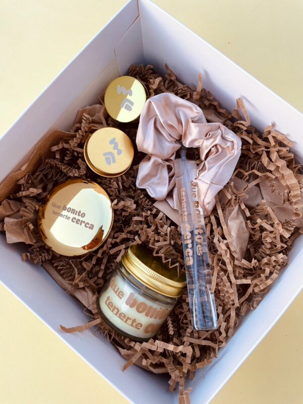 Caja de regalo BEAUTY de la colección «Que bonito es tenerte cerca» compuesta por coletero, espejo dorado, vela aromática, crema corporal, bálsamo labial y perfume.