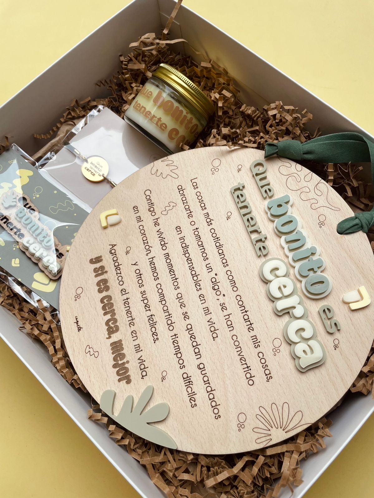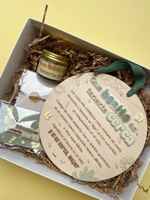 Box de regalo LOVE «Que bonito es tenerte cerca» compuesta por placa dedicatoria, llavero, vela perfumada y pulsera.
