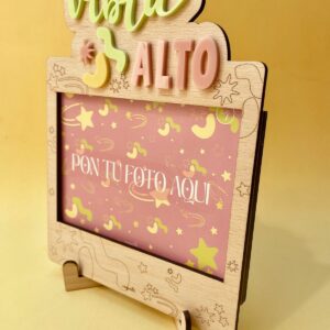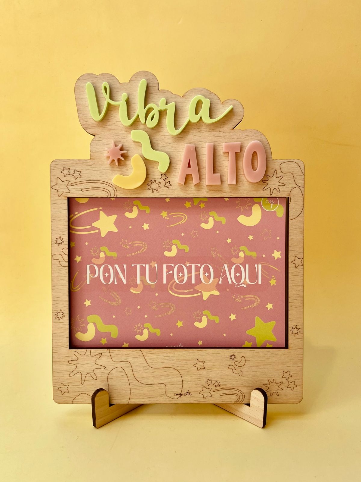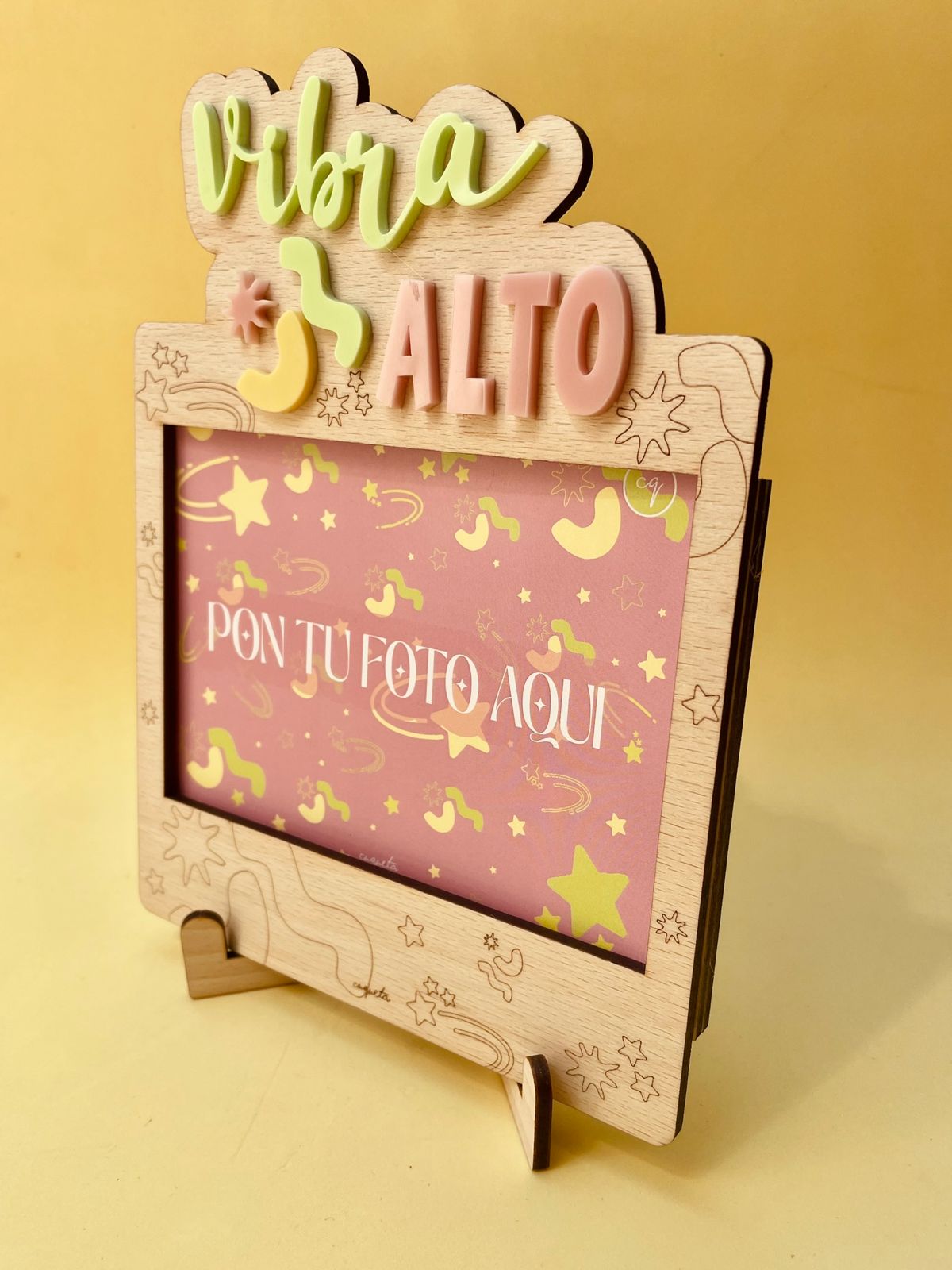 Marco en madera de haya y metacrilato en tono rosa, lima y amarillo de la colección «Vibra Alto». Para foto de 10×15 aprox.