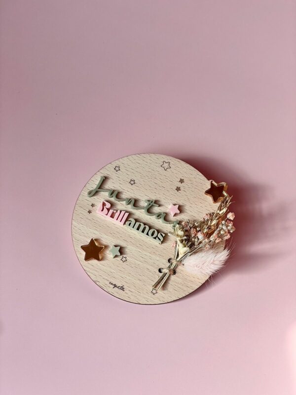 Mini placa imán «Juntas Brillamos» elaborado en madera de haya y metacrilato en diferentes tonos. Lleva un mini ramillete de flores preservadas en tonos rosas y verdes.