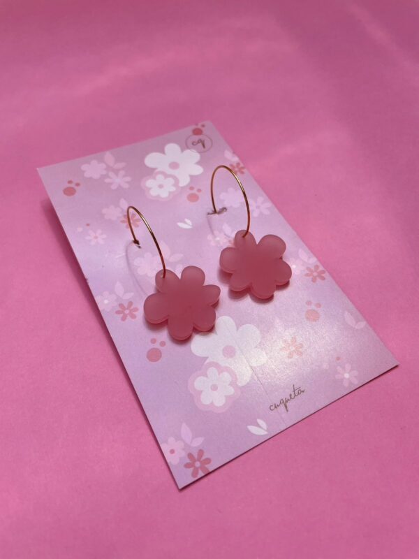Pendientes en aro dorado de 2.5 cm de diámetro con flor de 2 cm de diámetro en metacrilato rosa opaco. Pendientes estilosos y modernos.