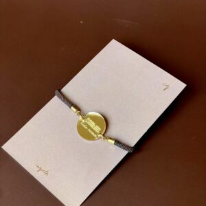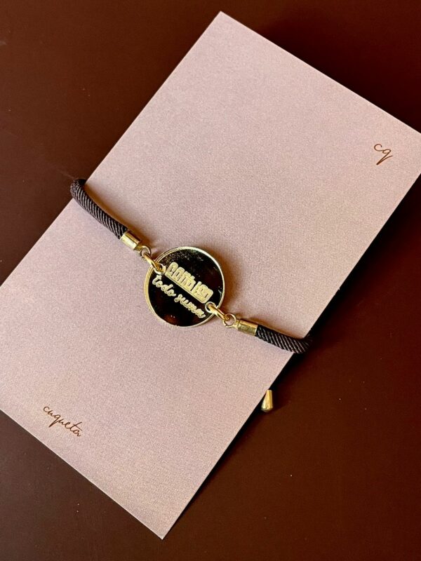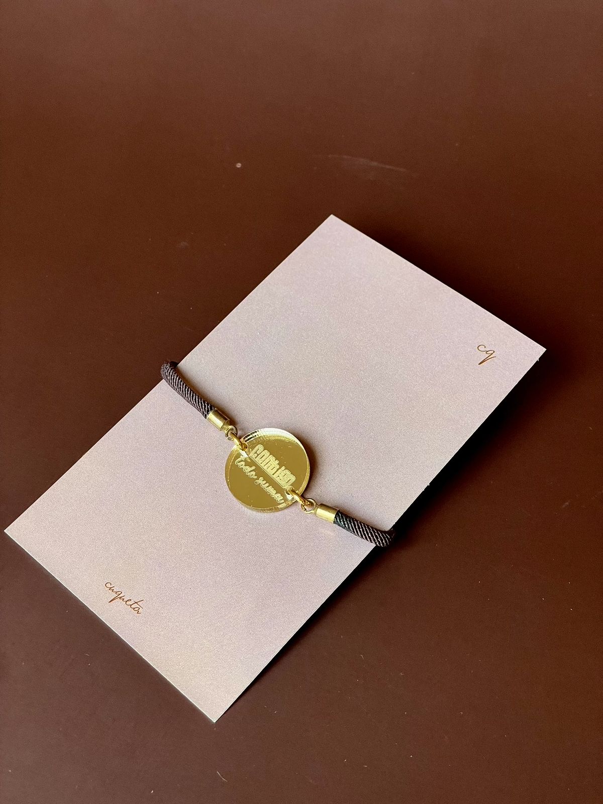 Pulsera de cordón redondo no elástico de 4mm de grosor en color marrón. Lleva una esfera en metacrilato dorado espejo, donde lleva grabado las palabras «Contigo todo suma».