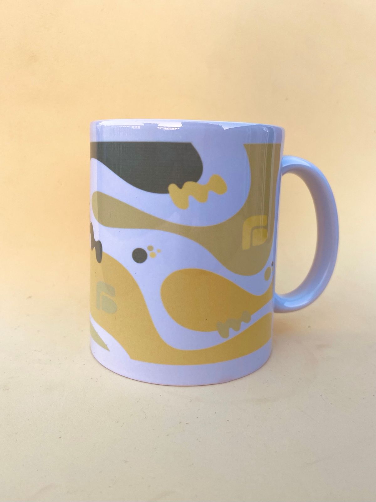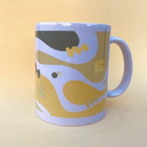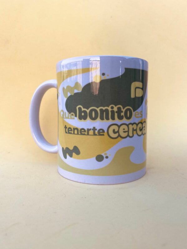 Taza de cerámica blanco brillo de la colección «Que bonito es tenerte cerca» sublimada con el logo y decoración.