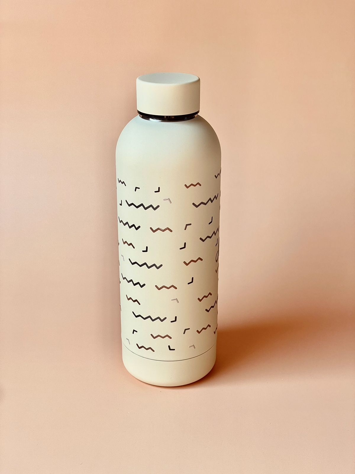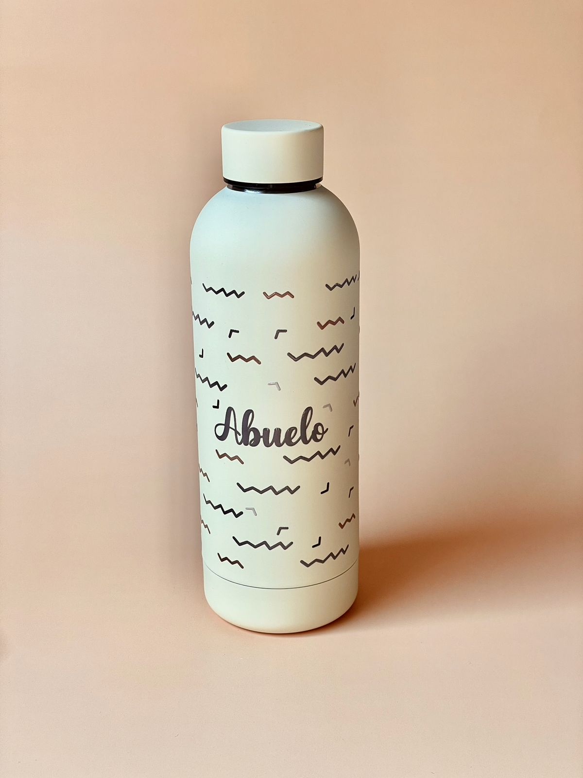 Botella beige de la Colección CÁPSULA de «Abuelo», de acero inoxidable. Mantiene la bebida 12 horas en frío y hasta 24 horas caliente. Capacidad de 500 ml. Tacto engomado.