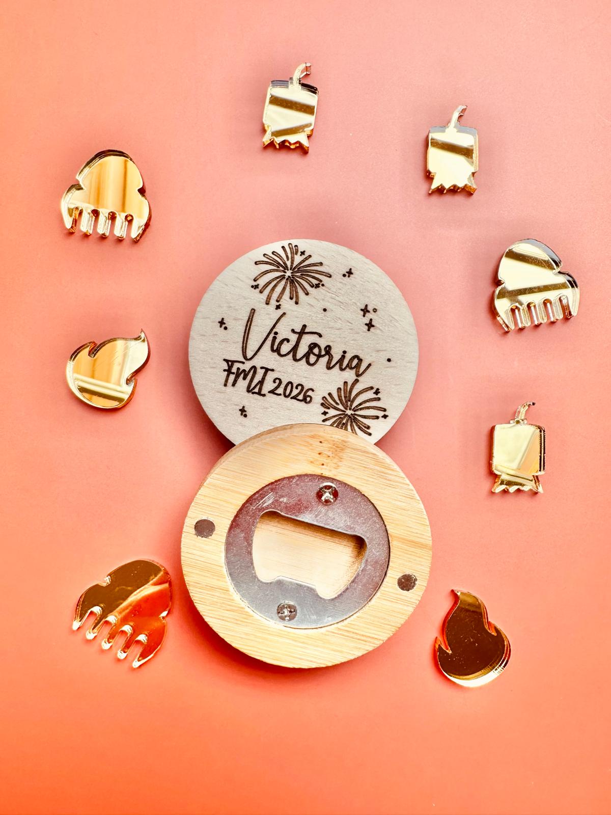 Personaliza el/los abridor/es escribiendo en el espacio, «Personaliza aquí» lo que quieres que grabemos. Por ejemplo: «Celia, FM 2026» (Ejemplo foto), o «Carlos, Presidente 2026», etc…