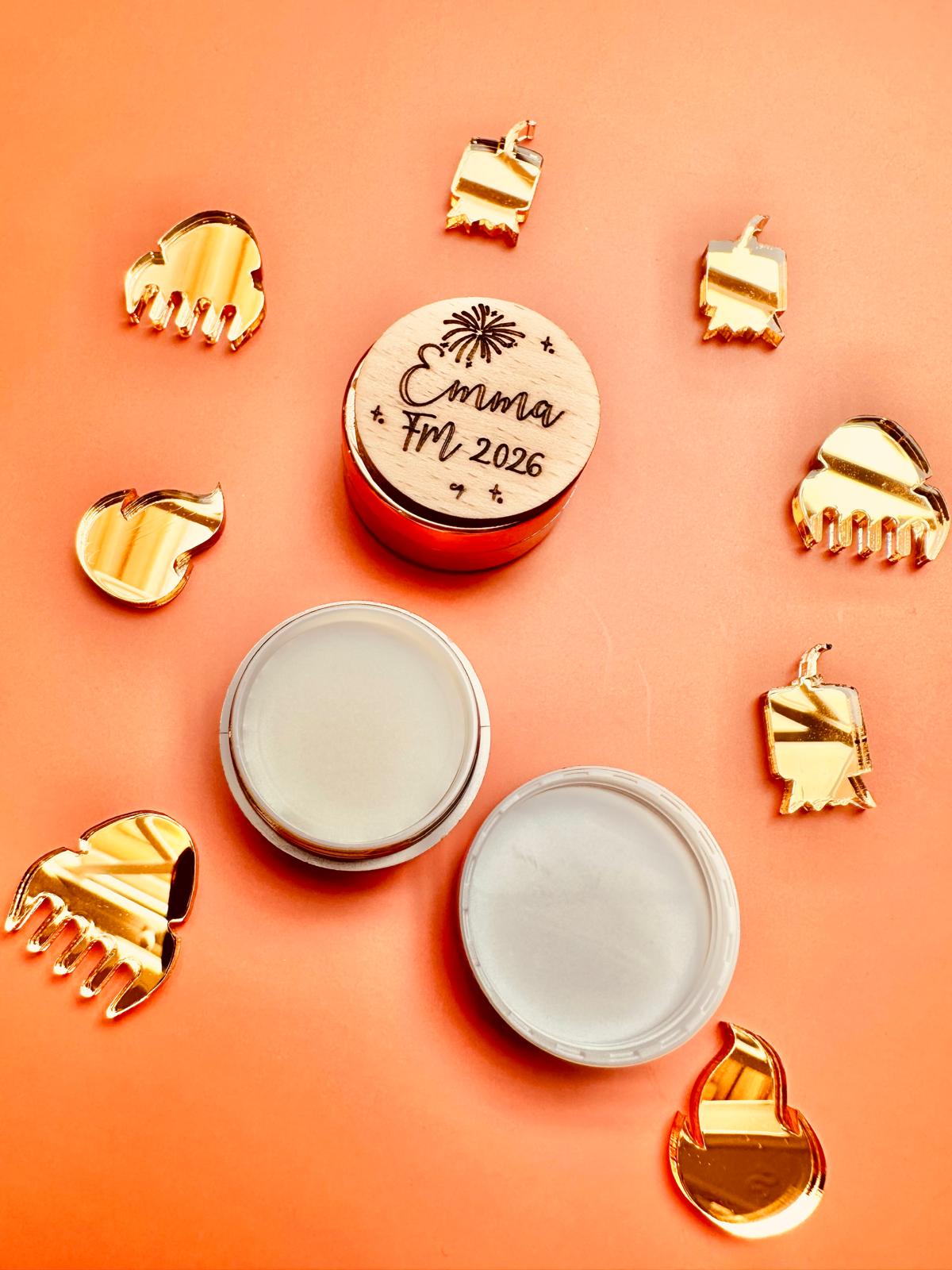 Personaliza el/los bálsamo/s escribiendo en el espacio, «Personaliza aquí» lo que quieres que grabemos. Por ejemplo: «Celia, FM 2026» (Ejemplo foto), o «Carlos, Presidente 2026», etc…