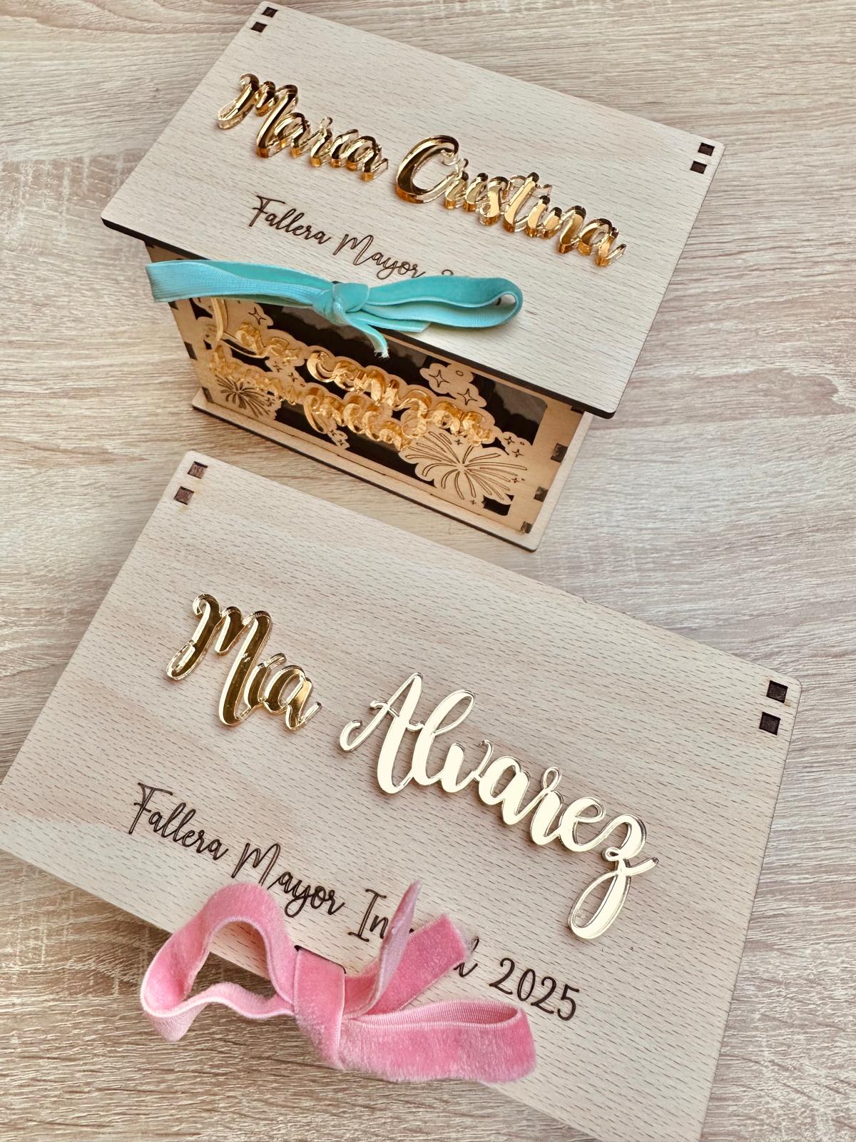 La tapa superior irá personalizada con el nombre de la Fallera/Presidente y su cargo.