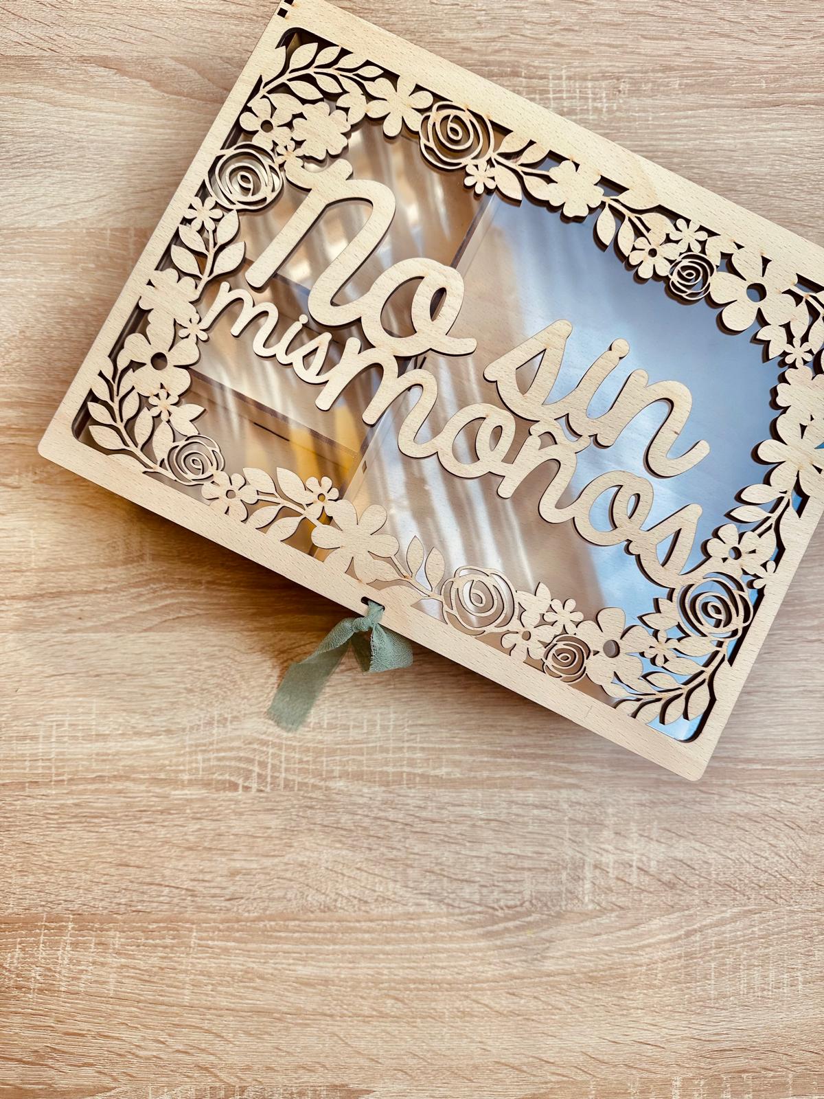 Caja para guardar moños de fallera con motivos florales. Caja de madera de haya, con tapa en acetato transparente y cierre con cinta de terciopelo.