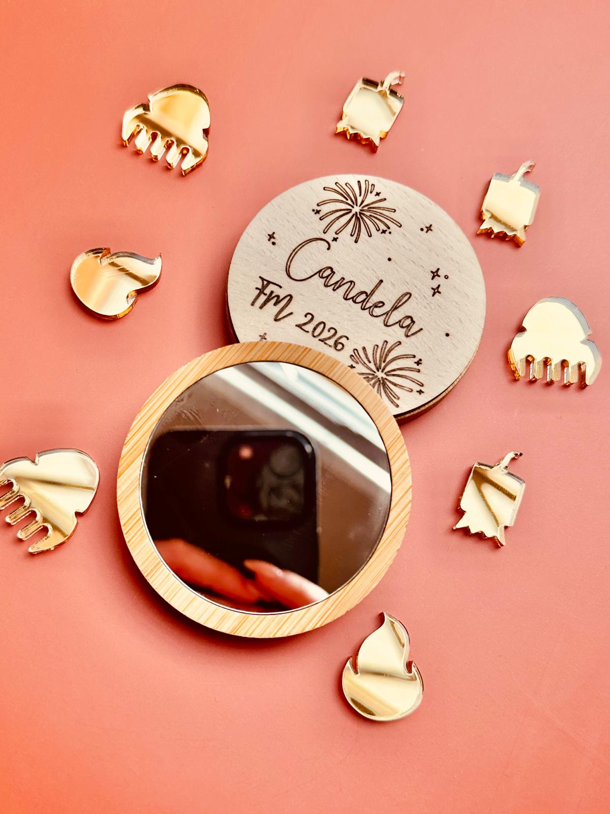 Espejo de 7 cm de diámetro fabricado con bambú. Diseño especialmente diseñado para «Fallas» con dibujo de fuegos artificiales.