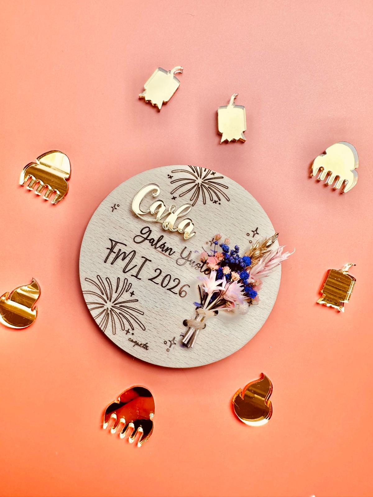 Mini placa imán modelo «Fuegos» de la colección de Fallas con ramillete, personalizada para regalar a otras falleras de tu mismo sector o para regalar como detalle.