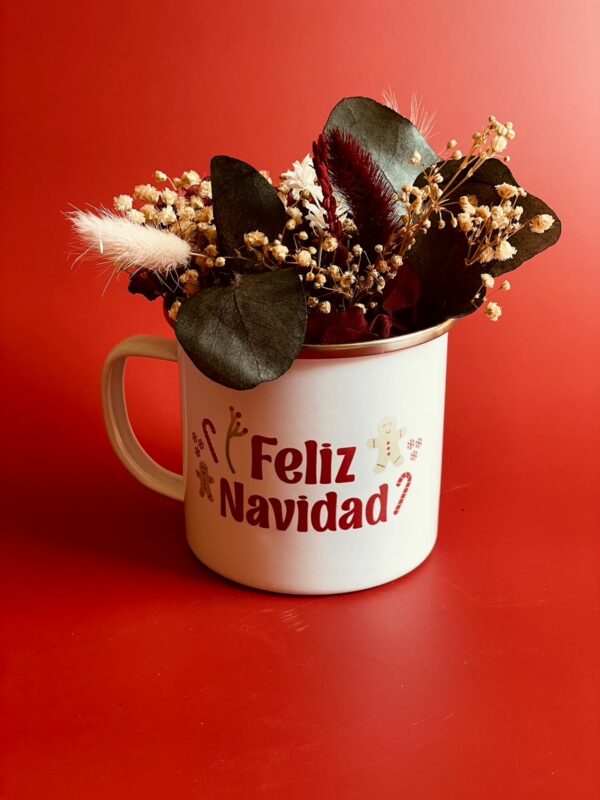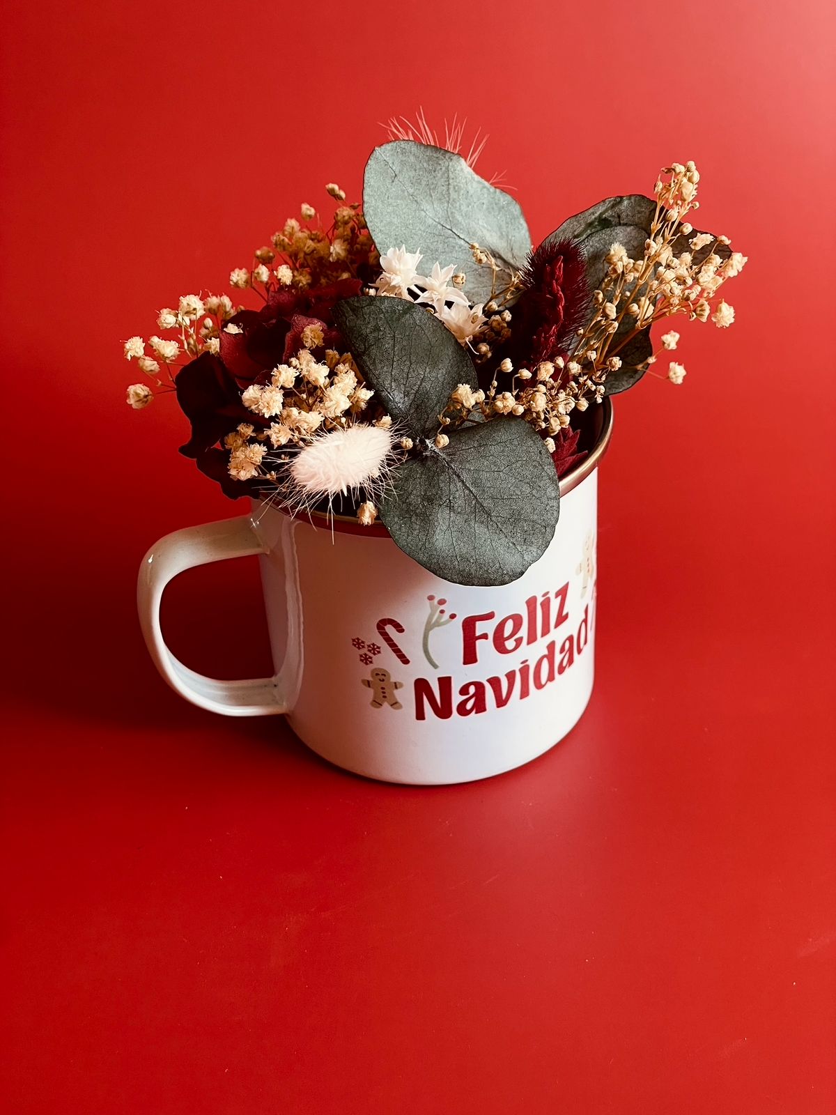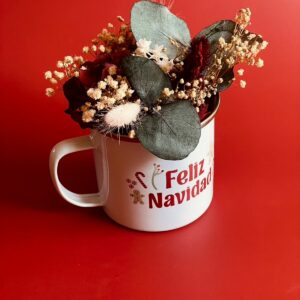 Taza metálica blanca sublimada con el logo «Feliz Navidad» compuesta por flores preservadas como hortensia, paniculata, eucalipto…etc.