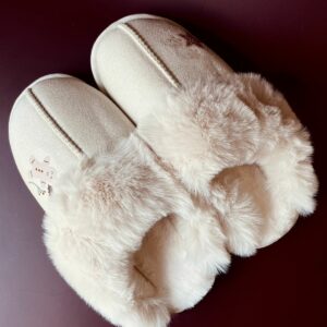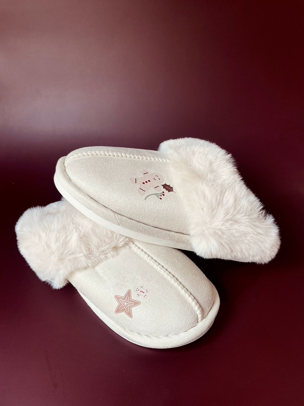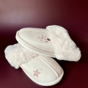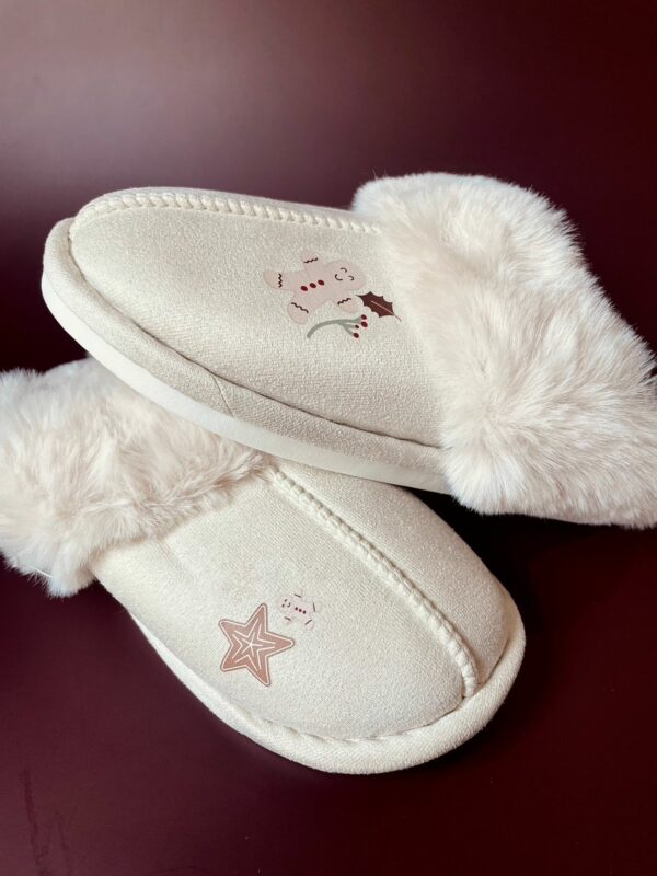 Zapatillas calentitas para invierno, con interior de forro polar en color blanco roto. Diseño navideño en el lateral de la zapatilla.
