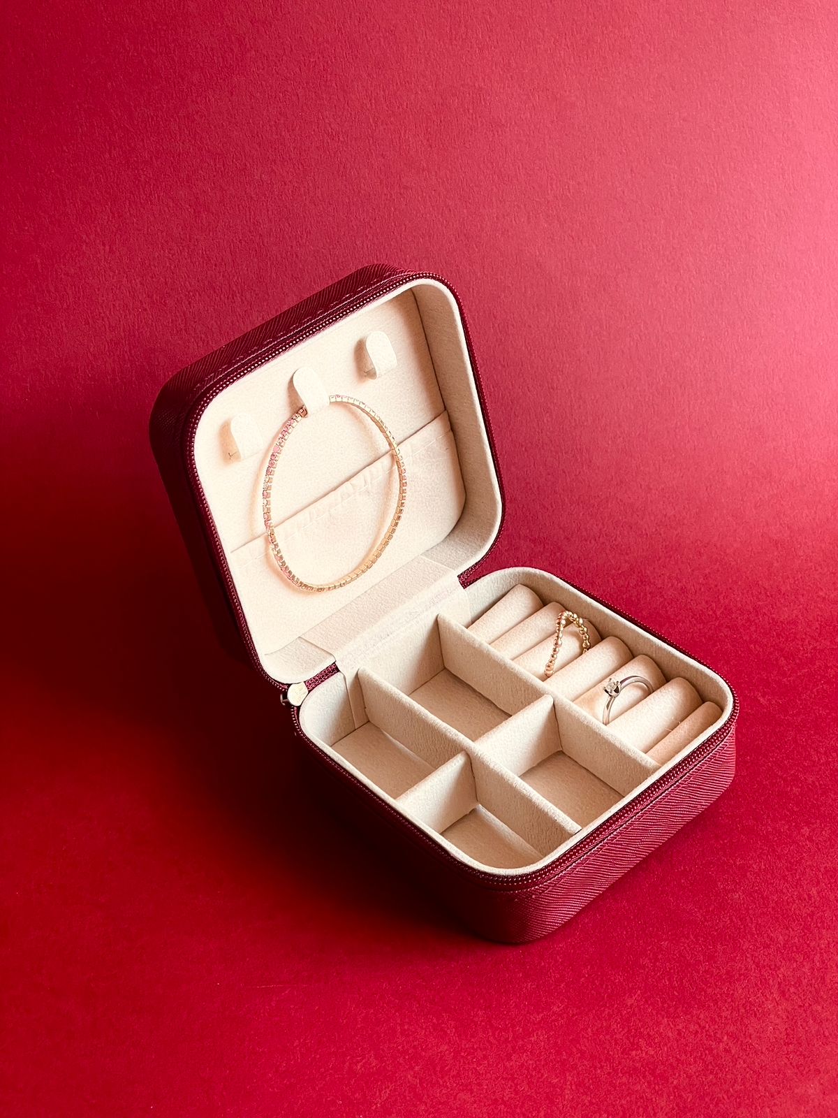 Su diseño sofisticado, fabricado en polipiel de alta calidad, de tono burdeos que aporta un toque de distinción y elegancia. Su interior esta forrado con un terciopelo en colo crema, creando un contraste suave y lujoso que cuida tus joyas.