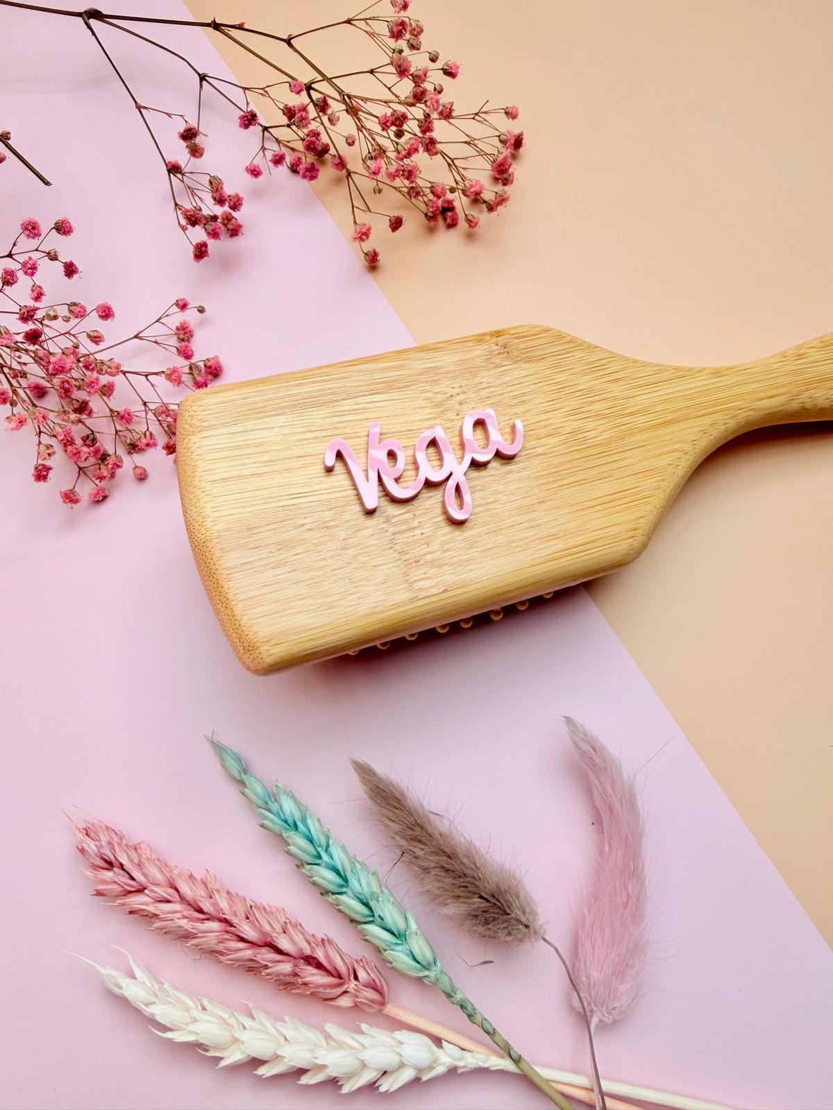 Cepillo de bambú pulido personalizado con el nombre en metacrilato del color escogido.