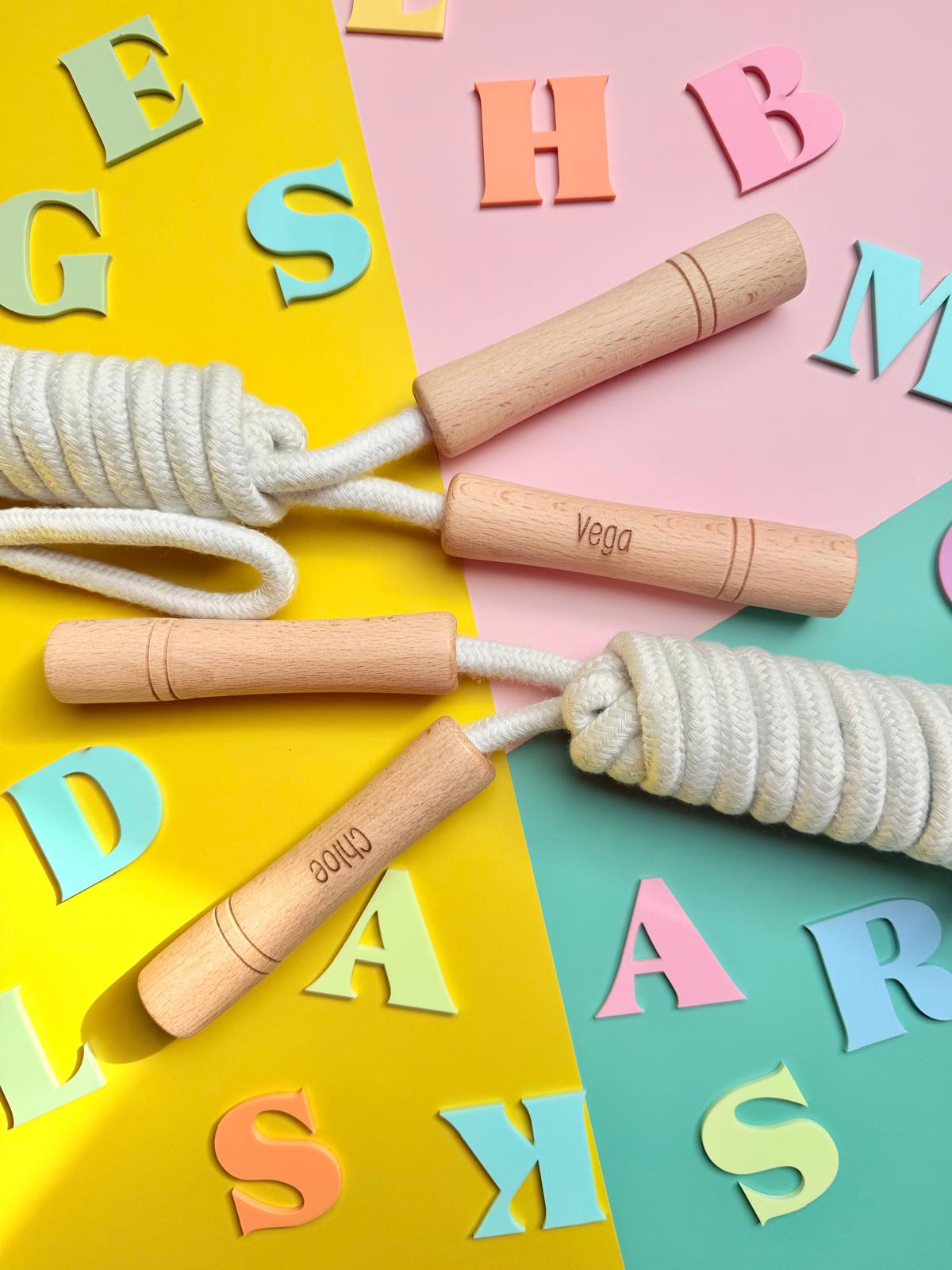 Divertida comba con cuerda extra larga de 240cm de largo. Mangos de sujeción en resistente madera.