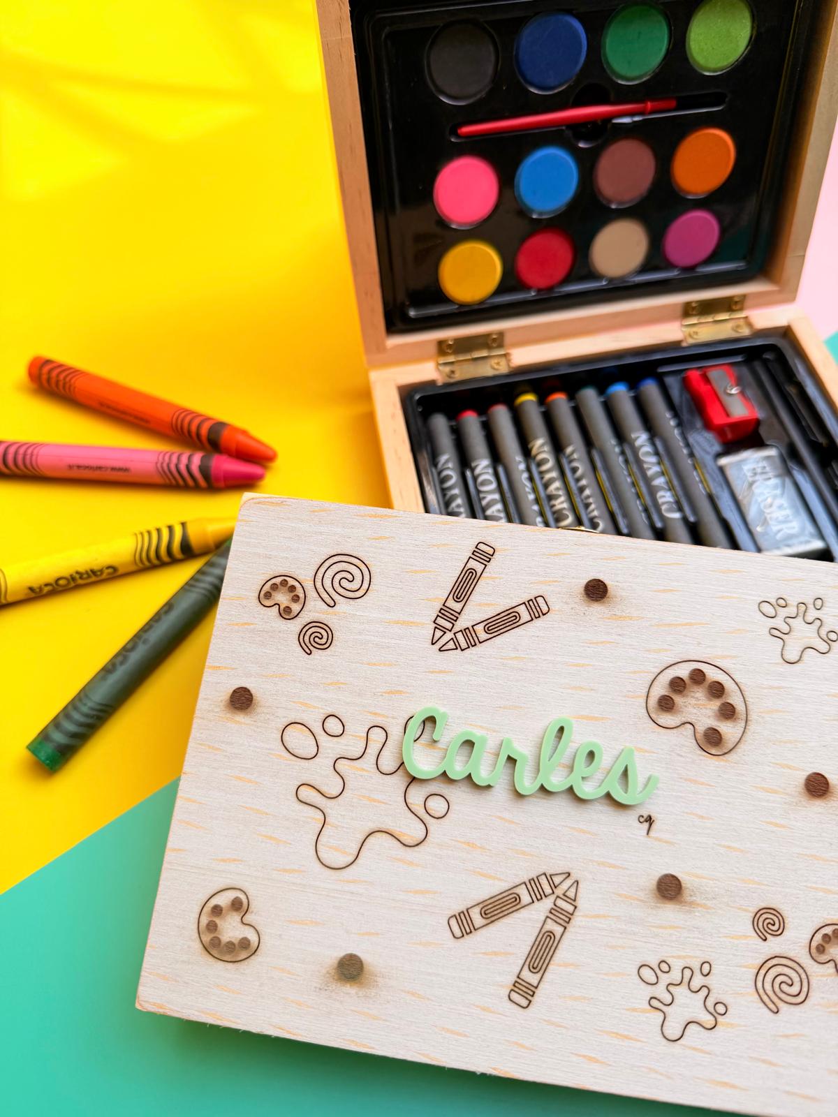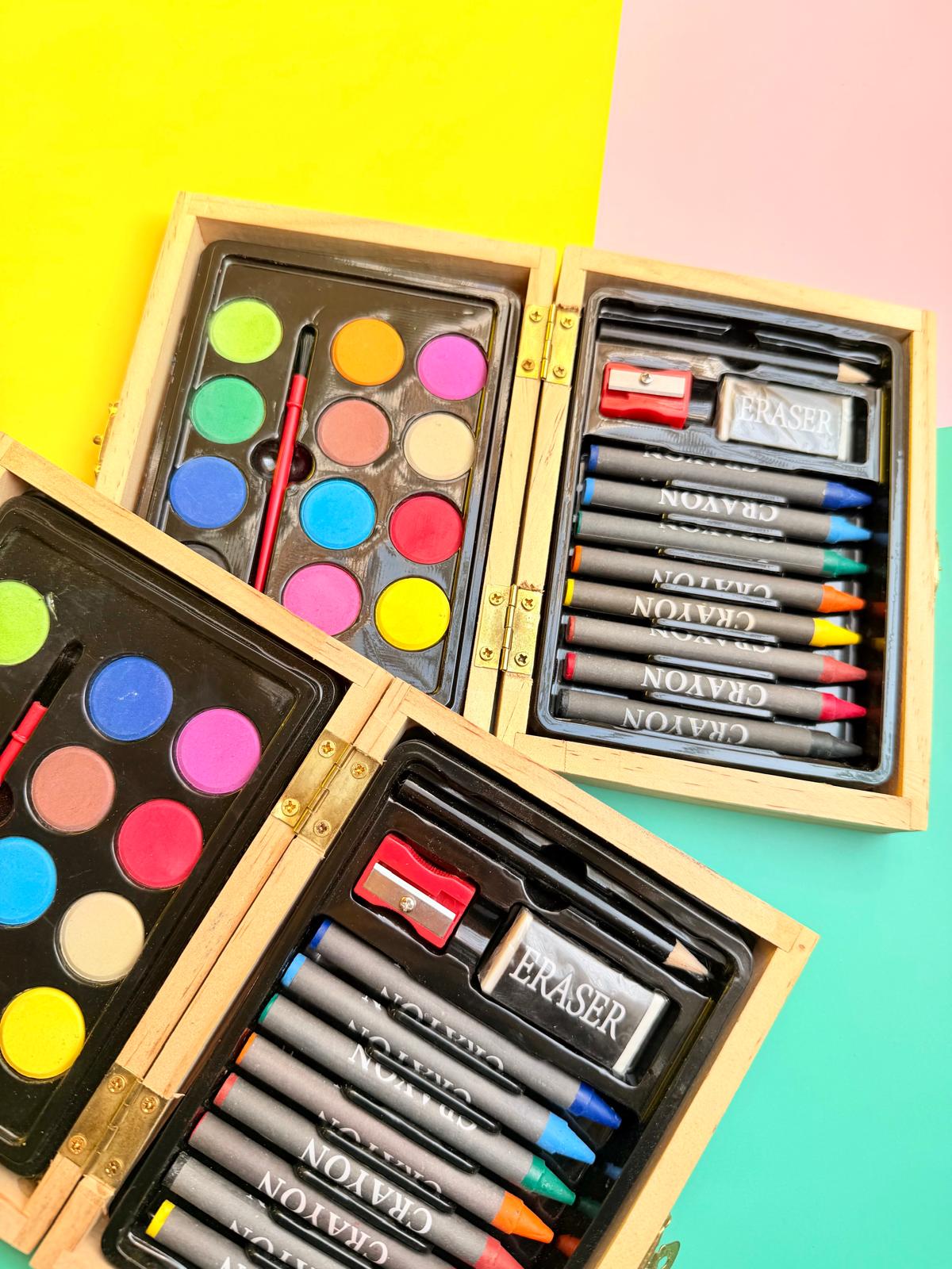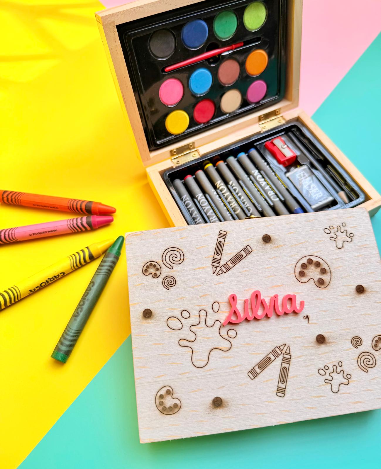 Mini maletín para colorear compuesto por 24 piezas, con cierre y bisagras de metal. En el contenido lleva 1 lápiz, 1 goma de borrar, 1 sacapuntas, 8 ceras variadas de colores, 1 pincel, y 12 acuarelas de colores variados.