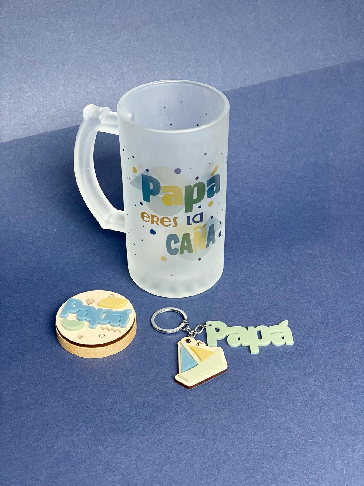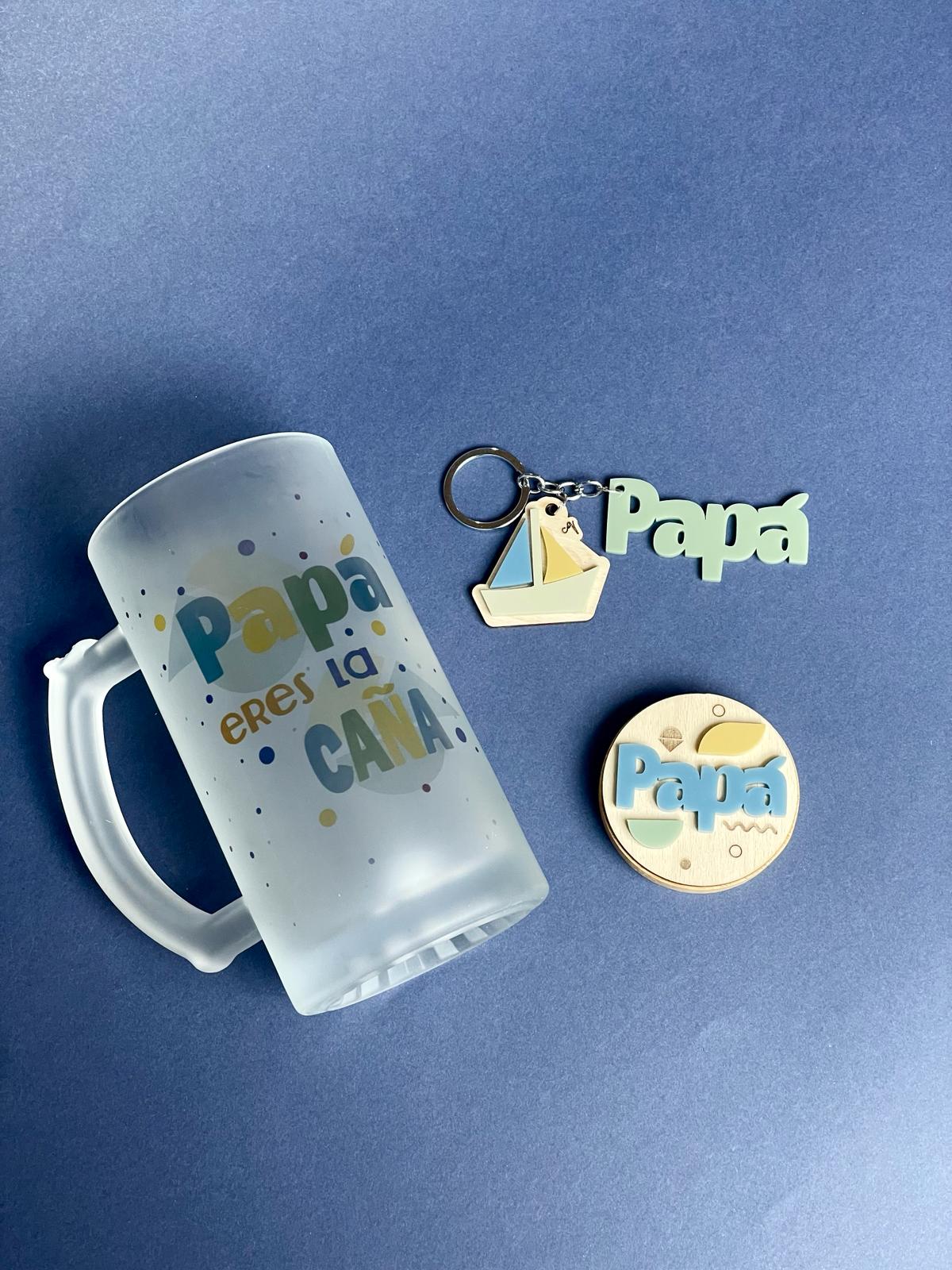Box regalo CERVEZA para papá que incluye jarra de cristal mate de 500 ml, abridor de bambú con imán en la parte trasera y llavero de madera.