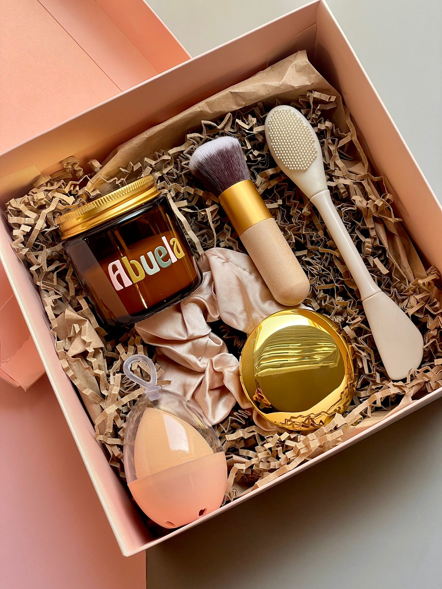 Box de regalo BEAUTY «Abuela» compuesta por esponja maquillaje, vela aromática, coletero de raso con color champán, mini brocha de maquillaje, espátula de silicona y espejo dorado.