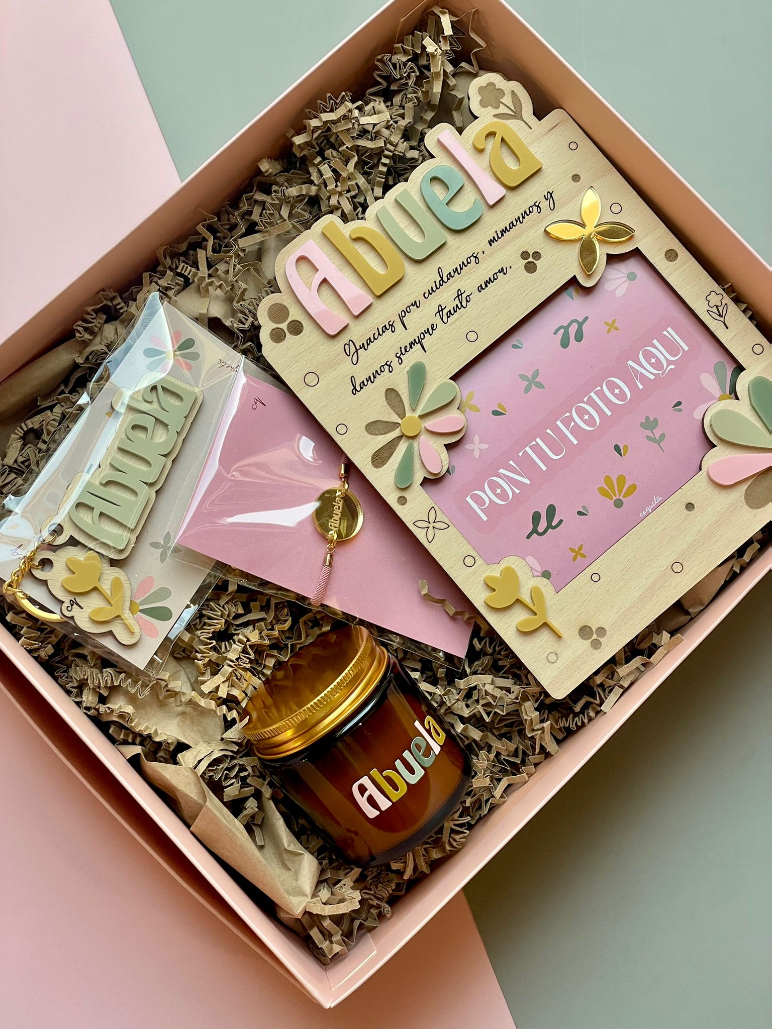 Box de regalo MOMENTS «Abuela» compuesta por marco de fotos con soportes de la colección Día de la Madre 2026, vela perfumada, pulsera de Abuela y llavero de la misma colección.