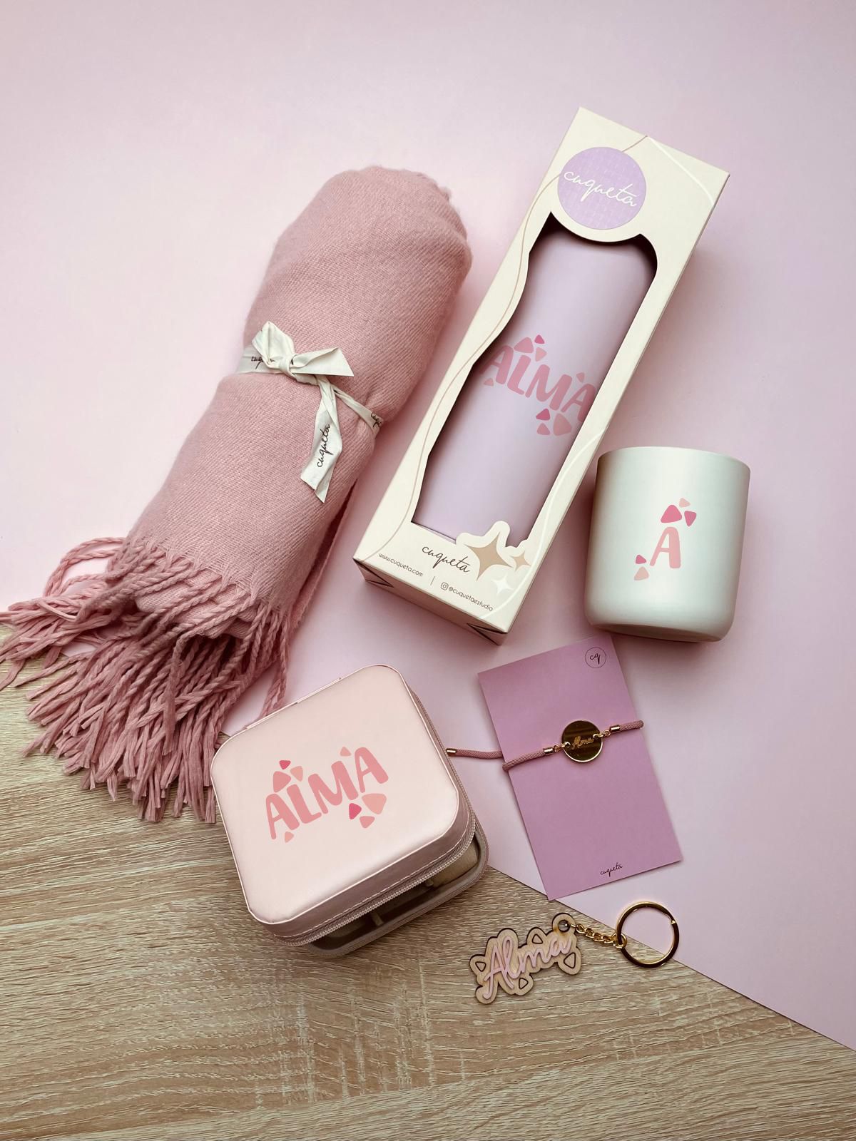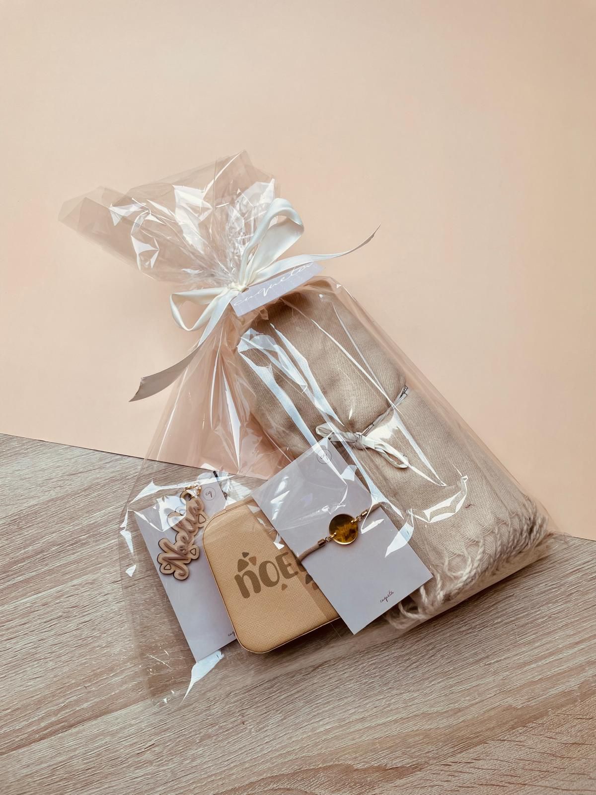 Los productos que puedes elegir son: Joyero de polipiel, bufanda de algodón calentita, botella isotérmica 500 ml, vela perfumada, llavero de madera y pulsera.