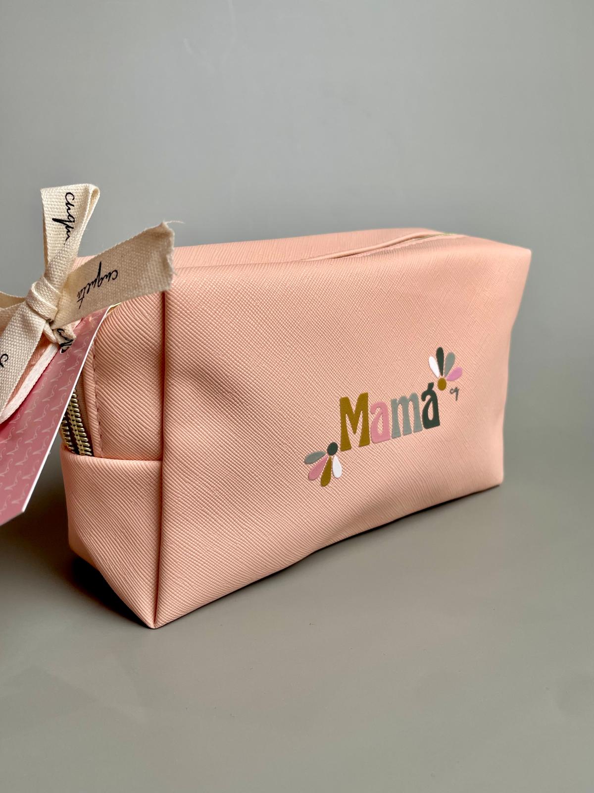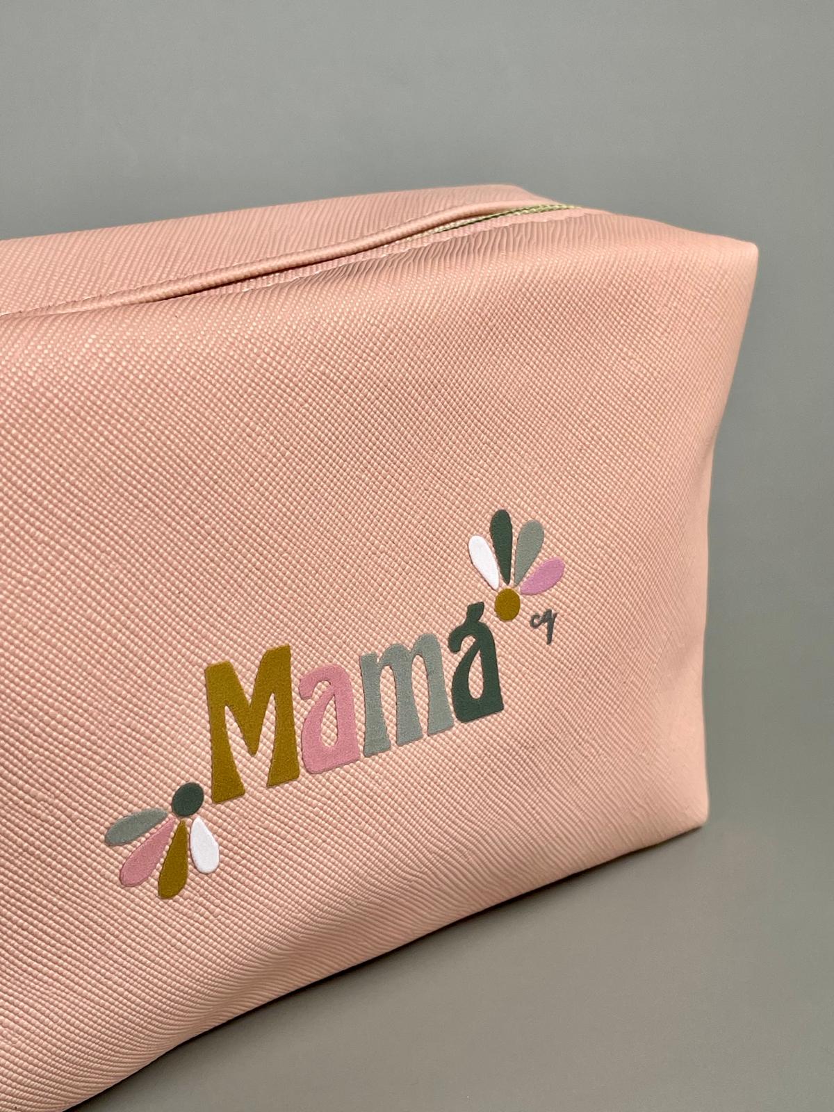 Estuche de polipiel en color rosa suave, decorado con la palabra «Mamá» mediante DTF. Tiene un tamaño de 17 cm de largo, 6 cm de ancho y 10 cm de alto. Interior forrado.