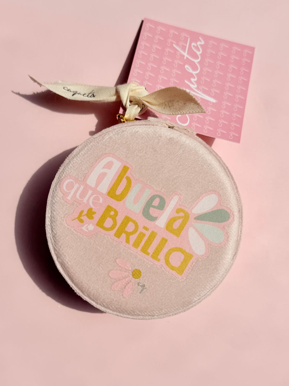 Joyero rosa «Abuela», de terciopelo extra suave. En su interior lleva varios compartimentos para poder separar los diferentes tipos de joyas. Tiene una medida de 10cm de diámetro.