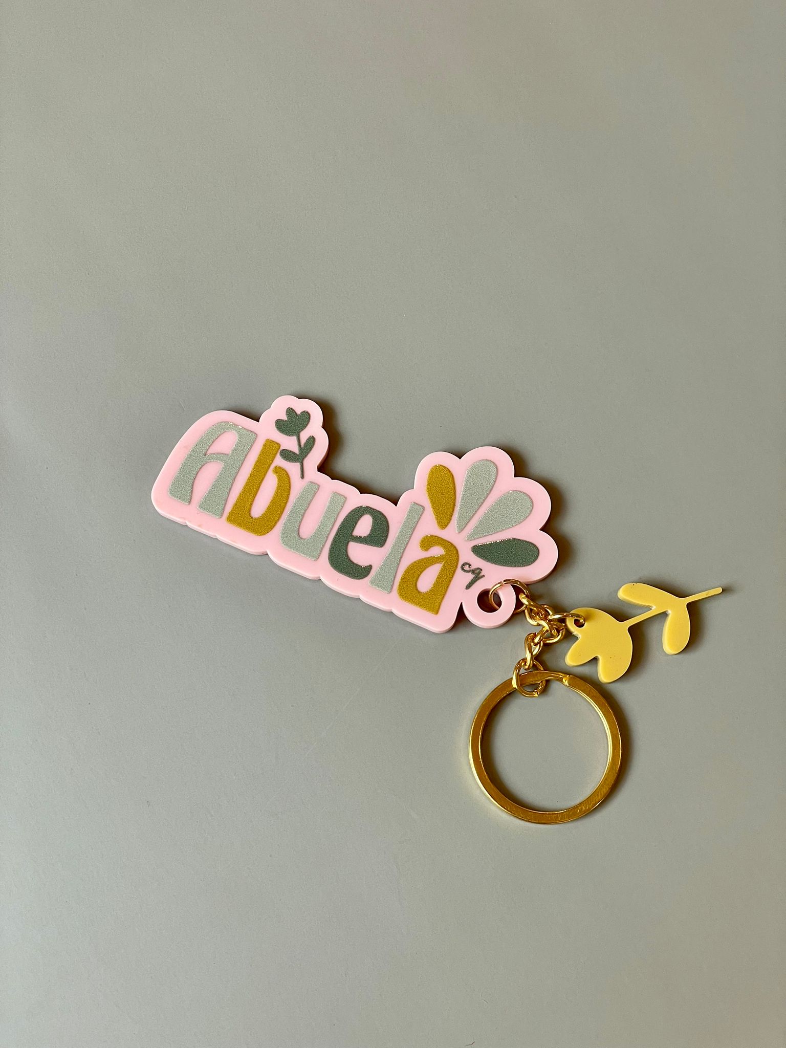 Sorprende a la Abuela con un accesorio práctico y lleno de significado. Este llavero con la palabra Abuela sobre una base de metacrilato color rosa pastel, combina modernidad y calidez gracias a su delicado mini charm en forma de flor en color mostaza.