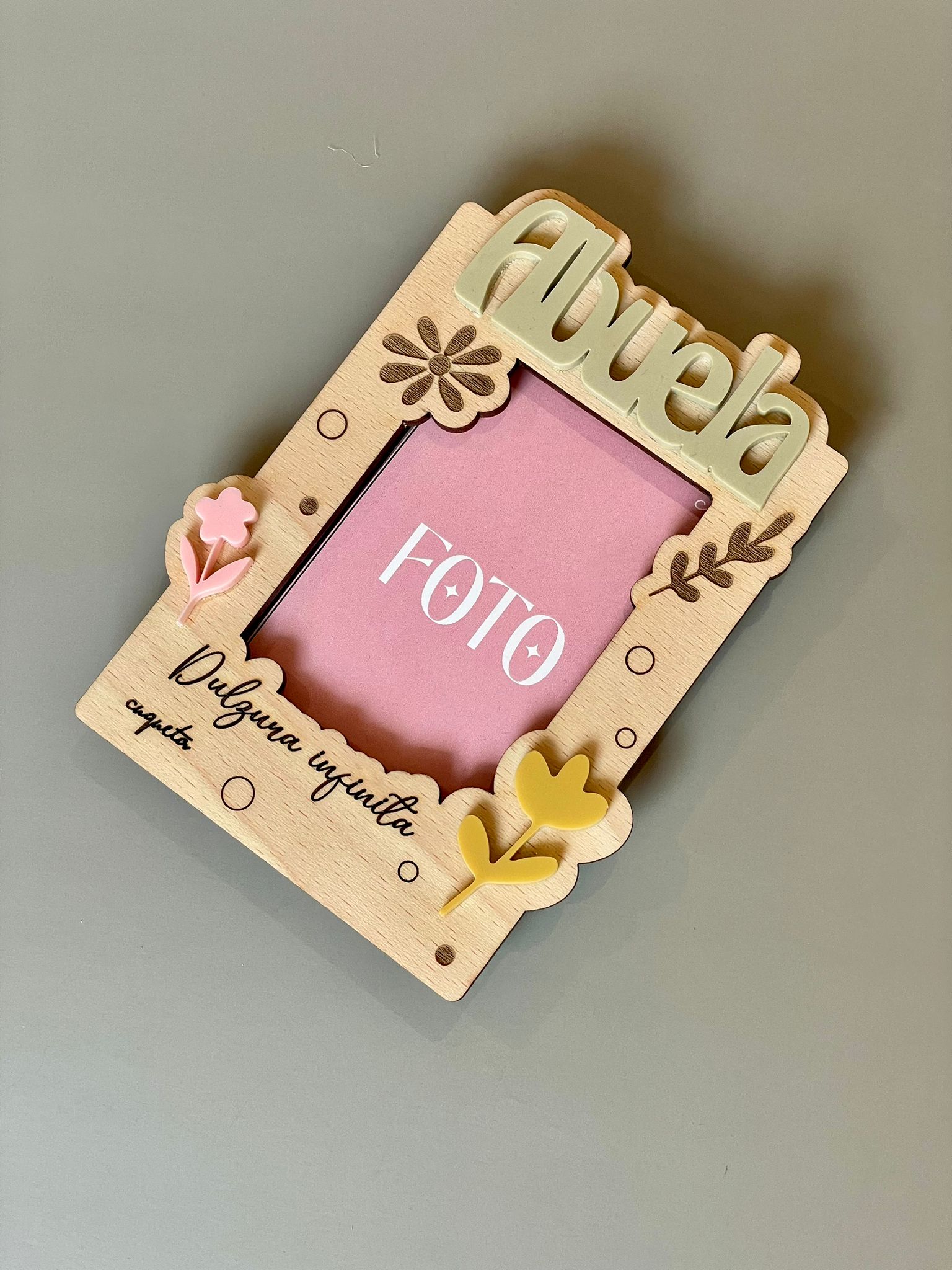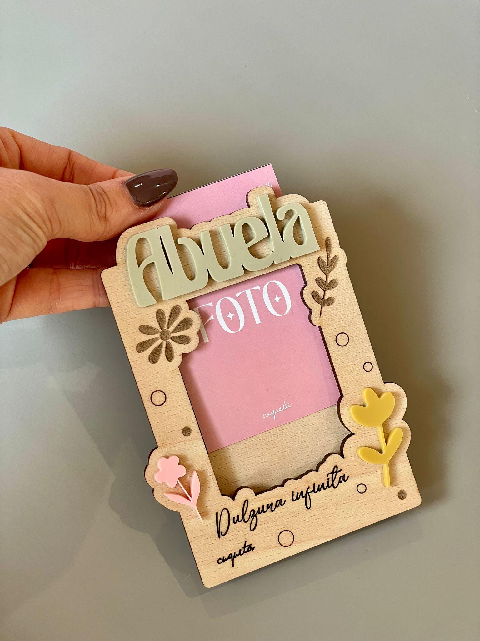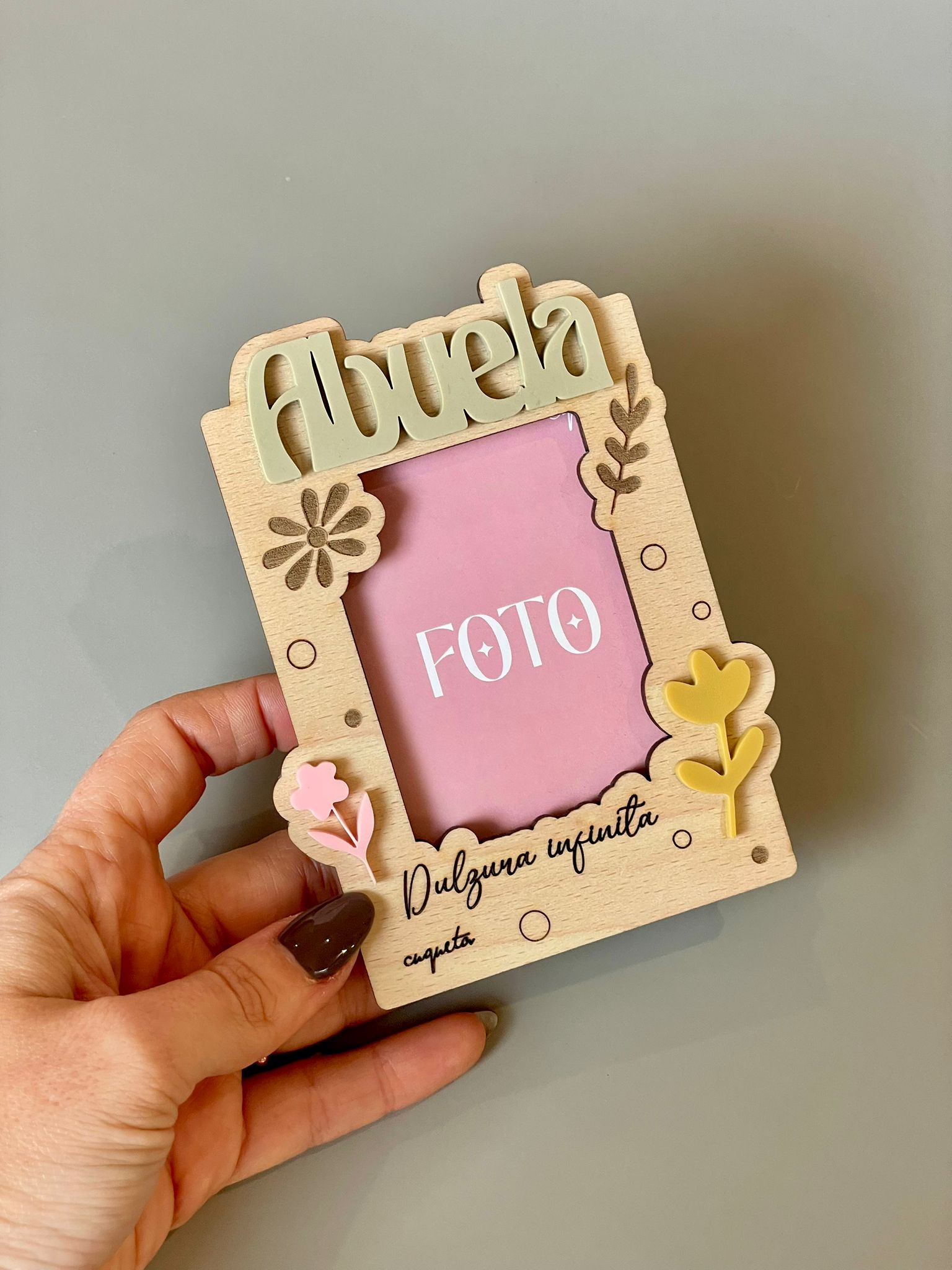 Si quieres personalizar el mini marco «Polaroid» para la Abuela, escríbenos en el apartado «Personaliza aquí», el nombre de quien lo regala o en su defecto, una frase muy corta (máx 2/4 palabras).