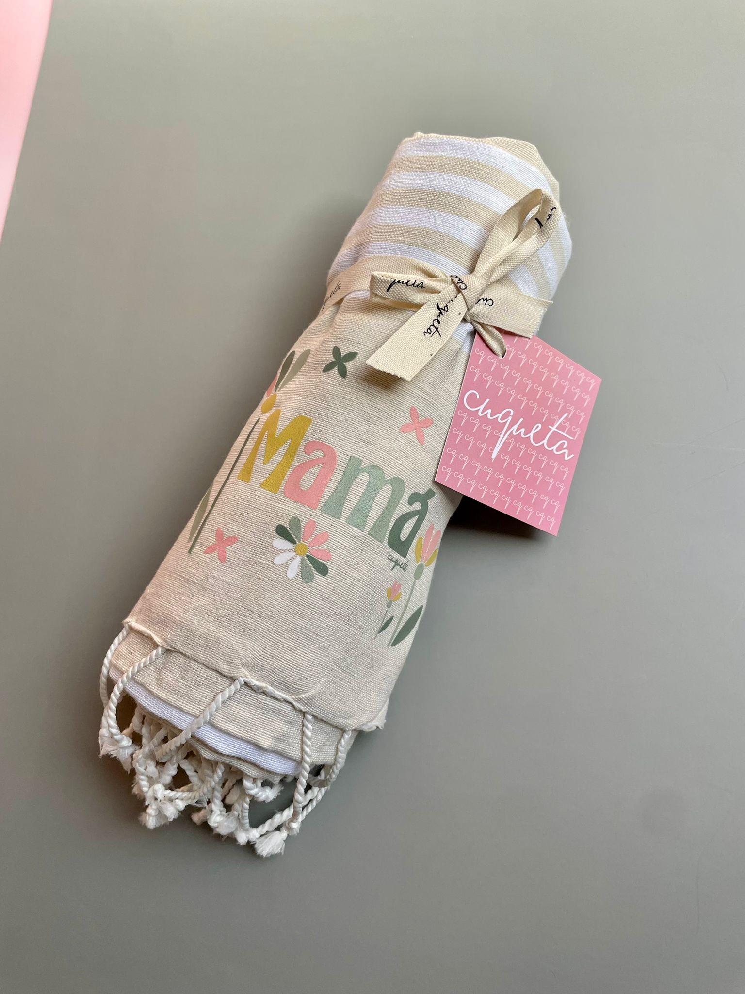 Toalla 100% algodón de la colección de «Mamá» de color beige y blanca. Lleva flecos blancos en los extremos de ambos lados. Logo mediante estampación textil DTF.