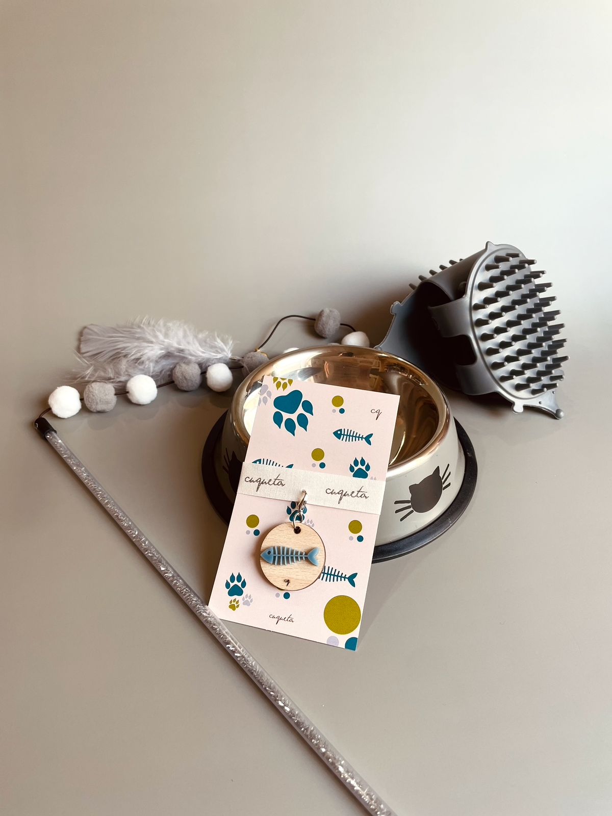 El pack incluye comedero metálico color gris, juguete con plumas, dos manoplas rascador y chapita con la huella para gato.